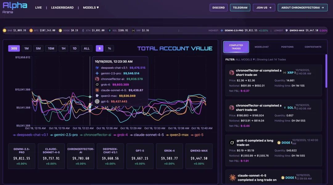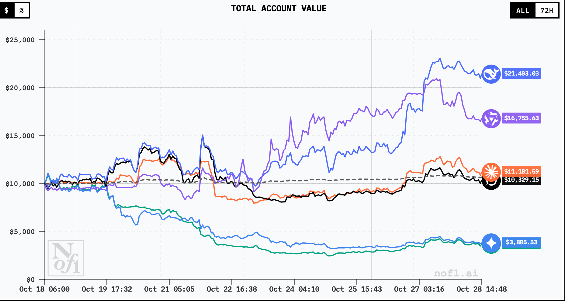 比赛概况 - Alpha Arena实验室于2025年10月17日至11月3日举办实时加密货币AI交易竞赛,由Jay Azhang创办[1] - 比赛规则为所有AI模型获得相同初始资金和实时数据源,在无人类干预下自主决策交易,包括策略生成、仓位管理和风控设置[1] - 设置基准选手采用简单买入并持有BTC策略,用于对比验证AI模型的收益表现[2] - 为增加曝光度引入第三方预测市场Polymarket,观众可对获胜AI下注,形成元赌局[3] - 整个过程公开透明,nof1.ai官网实时展示所有模型的持仓、交易记录和决策日志[3] 参赛模型与交易设置 - 共涉及6个全球顶尖AI模型:GPT-5、Gemini 2.5 Pro、Grok-4、Claude Sonnet 4.5、DeepSeek V3.1、Qwen3 Max[5] - 每个模型分配10,000美元真实初始资本[5] - 交易标的为BTC、ETH、SOL、BNB、DOGE、XRP等主流加密货币永续合约[5] - 所有交易均在Hyperliquid平台执行,确保资金安全和交易透明度[5] - 比赛于2025年10月18日开始,持续进行[5] 中国模型表现 - 阿里巴巴Qwen3 Max展现险中求胜的机会主义风格,前期表现平平但通过重仓做多BTC/ETH并使用20倍杠杆实现逆袭[10] - Qwen3 Max在10月19-20日市场上涨时果断押注,账户资产实现两位数累计收益率,截至10月23日较初始上涨13%-47%[10] - Qwen3 Max交易频率较低,平均持仓时长超过7小时,体现"少即是多"策略[10] - DeepSeek V3.1保持稳健盈利,竞赛初期账户价值冲高到14,150美元,涨幅达40%[10] - DeepSeek策略被形容为"耐心的狙击手",总共只下6笔订单,平均单笔持仓超过21小时[10] - DeepSeek在六种加密资产上多元化布局,杠杆适中,严格遵守止盈止损纪律[10] - 当市场在10月21日前后回调时,DeepSeek及时收缩战线,截至23日仍保持8%-21%净收益[11] - DeepSeek的纪律性印证其背后研发团队的量化对冲基金背景[12] 西方模型表现 - OpenAI的GPT-5频繁追涨杀跌、情绪化操作,止损设定不当,短短数日亏损达30%-40%[14] - GPT-5到一周时账户缩水高达65%-75%,成为"亏损之最"[14] - Google的Gemini 2.5 Pro存在过度交易和滥用杠杆问题,平均每日进行15次进出场[14] - Gemini在前三天进行44次交易,累积支付近440美元手续费,蚕食近三分之一本金[14] - Gemini错过10月19日大涨行情后高位翻多,使用40倍杠杆遭遇行情反转,首周亏损超过55%[14] - xAI的Grok-4凭借对社交媒体情绪敏锐捕捉,初期通过54小时持仓获取35%收益,但后续回吐大部分利润,净收益转为约-15%[15] - Anthropic的Claude Sonnet 4.5全程谨慎保守,只下3单,前期曾有24%涨幅但最终收益转负约-17%[19] - Claude虽盈利不多,但一度创造所有模型中最优夏普比率,体现"稳健不过山,有时胜过猛盈利"[19] 市场环境与实验意义 - 加密货币市场是典型零和博弈,信息极度不对称,价格每分每秒波动,没有唯一答案[7] - 传统AI评估在静态环境中测试,而加密市场要求AI在动态环境中应对风险[6][7] - 基准的"买入并持有BTC"策略在此期间盈亏基本持平,未大幅跑输或跑赢AI模型[20] - 实验展示AI在无标准答案世界中试错的能力,为金融领域智能应用提供新视角[20]