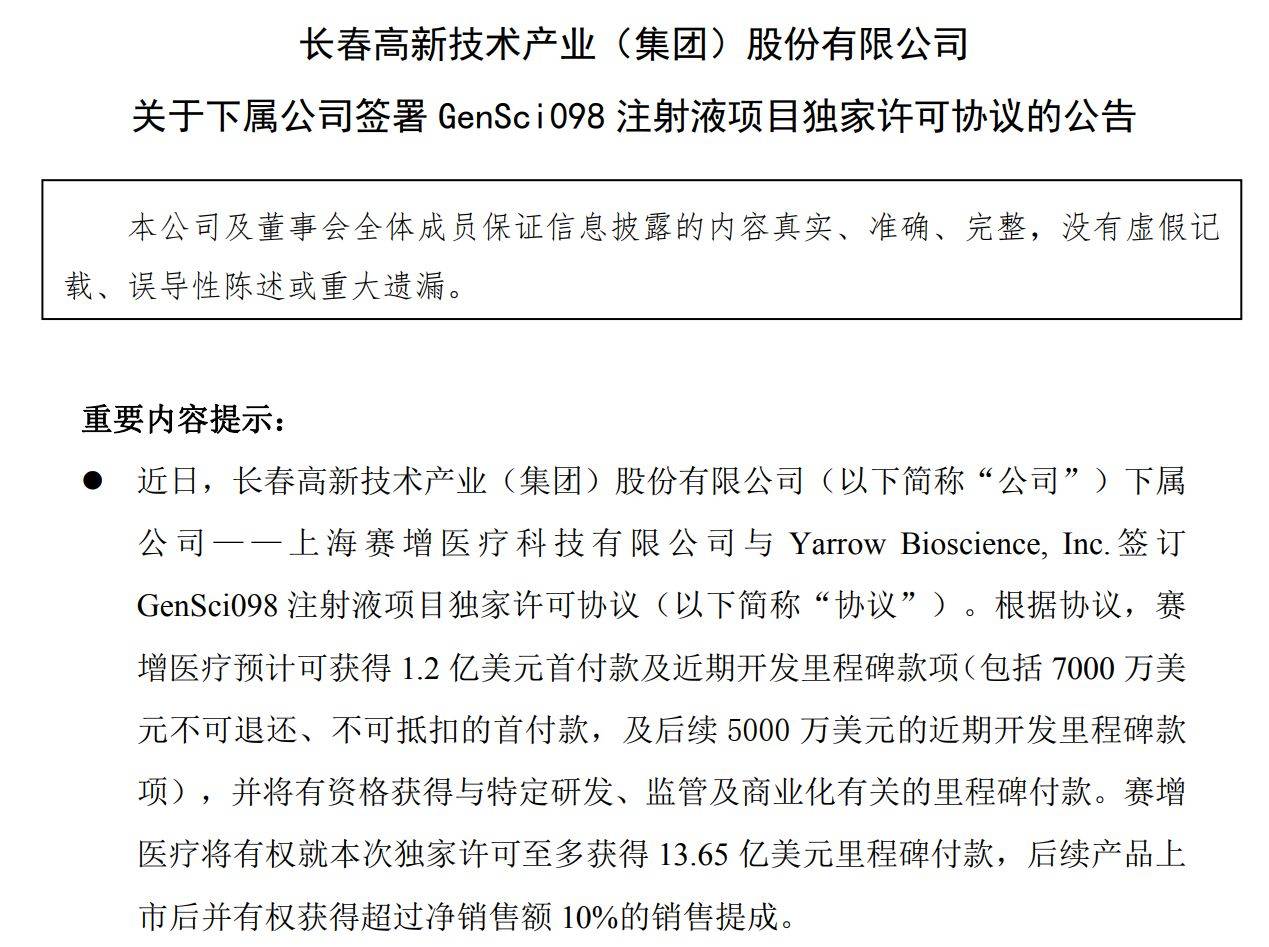 长春高新(000661)技术产业(集团)股份有限公司(以下简称"长春高新")迎来里程碑式BD(商务拓展)合 作落地。 战略转型加速落地 本次合作的落地,标志着长春高新从单一生长激素业务,向生长激素、创新药、研发BD收入并驾齐驱 的战略转型迈入实质性兑现阶段。 12月16日,长春高新发布公告称,其控股子公司长春金赛药业有限责任公司(以下简称"金赛药业")下属 全资子公司上海赛增医疗科技有限公司(以下简称"赛增医疗"),与美国新兴生物医药公司 YarrowBioscience,Inc.(以下简称"Yarrow")签订GenSci098注射液项目独家许可协议。 12月17日,长春高新相关负责人在接受《证券日报》记者采访时表示:"此次合作是我公司积极整合国 际资源的关键实践,通过与国际专业团队优势互补,正更积极地参与全球药物创新,推动源自中国的研 发成果惠及更广泛的患者群体。" 13.65亿美元里程碑式合作落地 根据协议,赛增医疗预计可获得1.2亿美元首付款及近期开发里程碑款项,其中包含7000万美元不可退 还、不可抵扣的首付款,以及后续5000万美元的近期开发里程碑款项。此外,赛增医疗还有资格获得与 特定研发、监管 ...