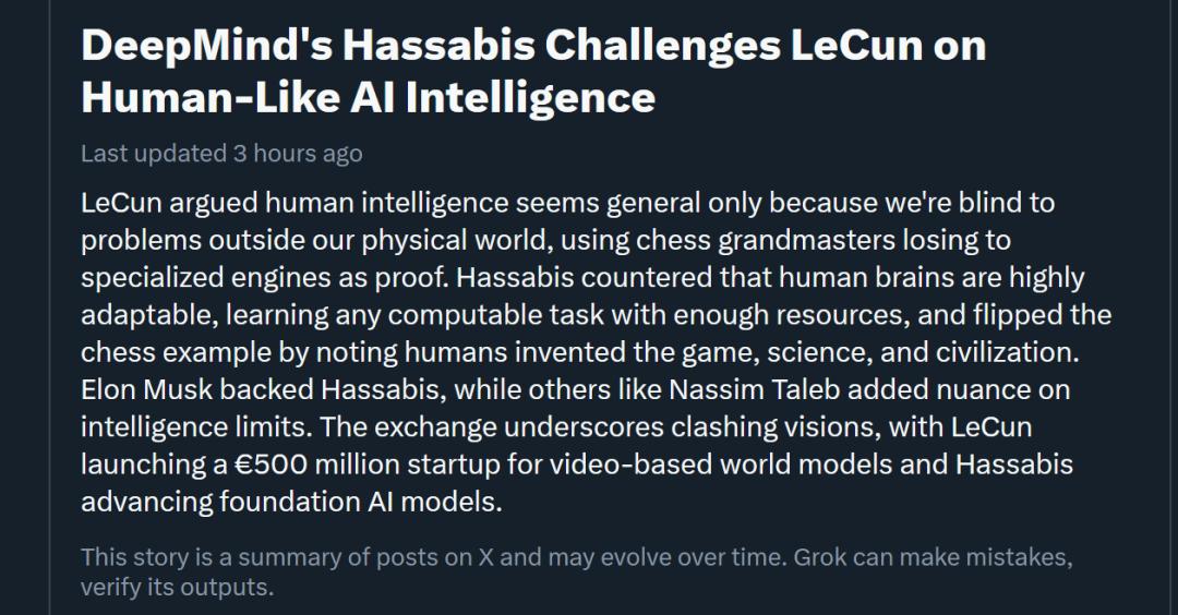 一水 发自 凹非寺 量子位 | 公众号 QbitAI 吵起来了。 图灵奖得主和诺贝尔奖得主,为了"智能的本质"——直接激情友好地交流上了。 AI三巨头之一、图灵奖得主Yann LeCun明确表示: 纯粹就是胡扯(complete BS)。 而诺贝尔奖得主、谷歌DeepMind CEO哈萨比斯也不留情面了,指名道姓回击: LeCun的说法简直是大错特错。 当然,马斯克的站队可能也有别的原因。毕竟他和LeCun素来不是很对付,跟哈萨比斯则亦师亦友——马斯克还是哈萨比斯DeepMind早期投 资人。 论战之激烈,关注度之高,已经让专门开辟了一个话题板块: 马斯克也跑来吃瓜了—— 没有任何多余的解释,但这波他站哈萨比斯——"Demis is right"。 事情还要从LeCun几天前接受的一场采访说起。 他在节目中言辞犀利地指出: 根本不存在所谓的"通用智能",纯粹就是胡扯(complete BS) 。 这个概念毫无意义,因为它实际上是用来指代人类水平的智能,但人类智能其实是高度专业化的。我们在现实世界里确实干得不错,比 如认个路、导航blabla;也特别擅长跟人打交道,因为咱们进化了这么多年就是干这个的。 但在国际 ...