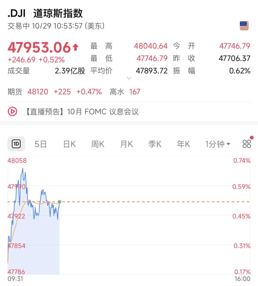 | 47953.06+ 最高 | 48040.64 今 开 47746.79 | | --- | --- | | +246.69 +0.52% 最 低 | 47746.79 昨 收 | | 成交量 | 47893.72 振 幅 0.62% | | | V | 见证历史。 当地时间10月29日,美股三大股指全线上涨,截至发稿,道指上涨0.52%,一度站上48000点,为道指首次突破48000点;标普500指数上涨0.25%,纳指上涨0.61%。 特朗普说:"我们是重要的合作伙伴。我们真的——我们紧密相连,我们有着非常特殊的关系。"同时,他还表示韩美企业之间的合作正不断拓展,覆盖造船、钢 铁、能源以及先进技术等多个领域。 特朗普还强调两国在制造业和供应链方面的合作,并表示美方正在与韩国企业展开合作,以重建美国的产业基础,并提高关键战略领域的抗风险能力。 消息面上,10月28日,美联储开始为期两天的议息会议,并将于当地时间29日下午(北京时间30日凌晨)公布最新利率决议。目前市场普遍预计,基于较弱的就业 数据,美联储或将进行今年内的第二次降息。 "美联储传声筒"Nick Timiraos认为,10月的FOMC会议在 ...