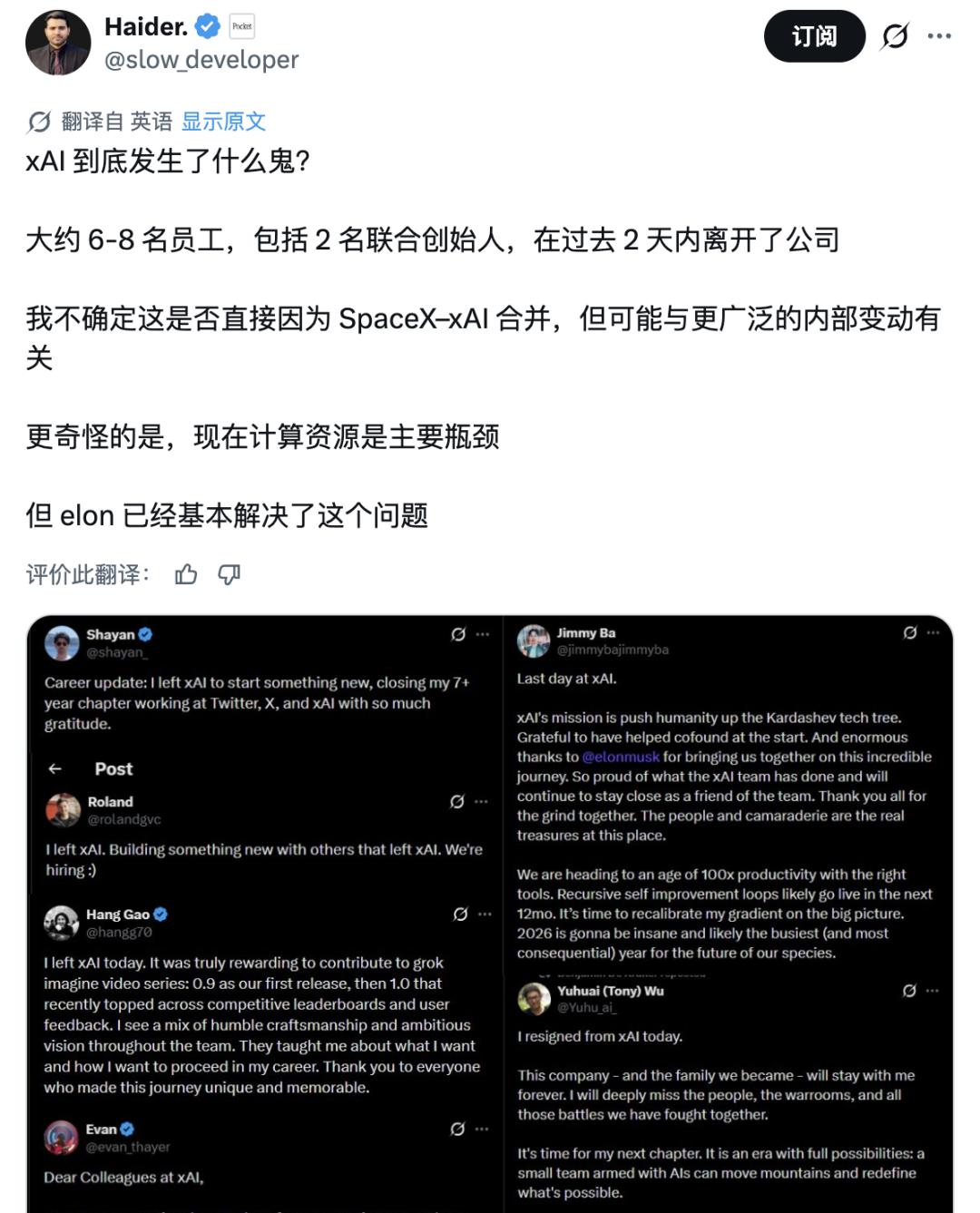 公司人事变动与组织重组 - 过去一周,xAI发生重大人事地震,12名联合创始人中有一半离职,至少9名工程师公开宣布离职,负责推理和研究安全的核心高管Tony Wu与Jimmy Ba也已离开[1] - 马斯克将此次变动解释为公司规模化必经的组织重组,旨在提高执行速度,并称快速成长时组织结构必须进化,导致需要与一些人分道扬镳[4][6][8] - 离职潮集中在2月6日至10日,涉及多名关键技术人员,包括产品基础设施负责人、多模态项目负责人等[11] 离职人员动向与潜在原因 - 离职员工的措辞暗示多种原因,包括希望用小团队做大事、认为AI实验室同质化“太无聊”,以及至少三名前员工已组队创业[4][10] - 核心离职高管Tony Wu表示“一个配备AI的小团队可以移山填海”,Jimmy Ba则称“递归自我改进循环很可能在未来12个月内上线”,并暗示将重新校准方向[8][9] - 有消息人士透露,马斯克对数据中心扩建的巨额投入未能使AI模型形成可持续领先优势感到不满,这种挫败感催生了新的领导架构和人员清洗[12] 公司新战略与业务重组 - 重组后公司设立四大新团队:分别负责Grok聊天机器人(含语音)、编程AI模型(对标Anthropic的Claude Code)、图像生成(Grok Imagine),以及名为“Macrohard”的数字化仿真项目[13] - Macrohard项目目标是对公司组织进行数字化仿真,让AI完成任何能使用电脑的人类可完成的事情,其负责人提及未来可能出现完全由AI设计的火箭发动机[13][16] - 公司启用年轻人才,如2023年高中毕业、2024年赢得xAI黑客松的Diego Pasini,现负责AI导师团队和Grokpedia项目[16] 公司运营数据与关联交易 - 马斯克透露X平台现有6亿月活用户,其产品负责人称订阅年经常性收入(ARR)刚突破10亿美元,并计划推出X Money银行功能等新服务[16] - xAI与SpaceX已宣布合并,合并后估值达1.25万亿美元,SpaceX计划最早在6月进行IPO,此次合并旨在推动“太空数据中心”项目[20] - 在合并敏感期,xAI面临监管审查,且过去30天内其Grok Imagine生成了60亿张图片,每天生成5000万段视频[12] 长期愿景与月球计划 - 马斯克在全员大会上提出“月球计划”,设想在月球建造工厂生产AI卫星,并用巨型电磁弹射器将其射向太空,以获取比地球数据中心更强的算力和能源[17] - 该计划的更大愿景是在月球建立“自给自足的城市”,进而探索火星及其他恒星系统以寻找外星生命[18] - 尽管前SpaceX高管称月球并非公司传统重点,但马斯克近期频繁讨论月球,表明公司路线已发生变化[20] 行业影响与公司现状 - xAI目前拥有1000多名员工,此次联合创始人集体出走在人才稀缺、声誉重要的AI赛道传递出潜在信号[22] - 马斯克声称xAI的发展速度比任何公司都快,但方向是否正确引发外界关注[22] - 公司重组和激进愿景(如月球AI工厂)展示了其在AI与太空领域融合的宏大布局[17][20]