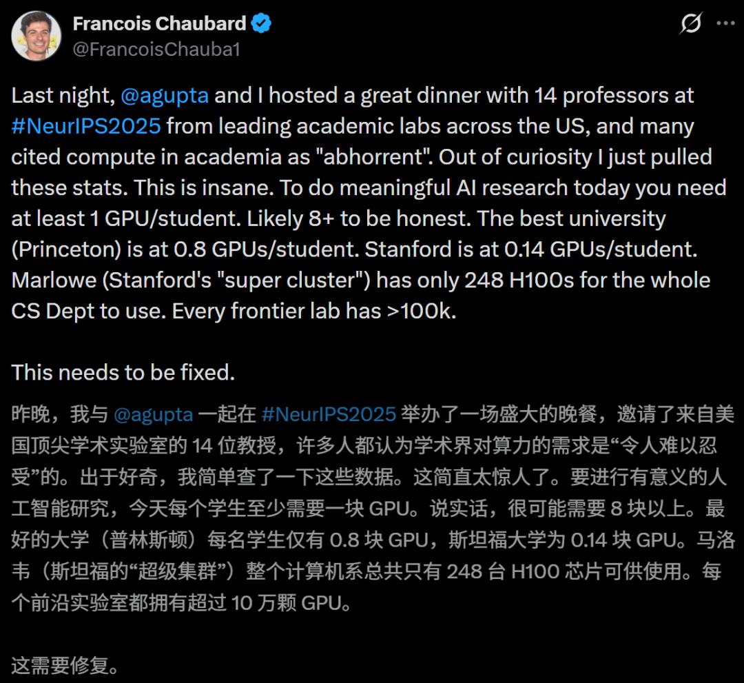 在工业界动辄十万卡的暴力美学面前,学术界正沦为算力的「贫民窟」。当高校人均不足0.1张卡时,AI科研的主导权之争或许已经没有了悬念。 学术界的GPU荒,比想象中还要严重百倍! NeurIPS 2025期间,两位YC大佬组了个饭局,邀请14位美国顶尖高校实验室的教授。 没想到,席间很多人都在吐槽:学术界算力资源简直「惨不忍睹」! 出于好奇,Francois Chaubard就去扒了一下数据,得到的结果离谱到家..... 以下是美国顶尖大学实验室的情况—— 如今,想要做点像样的AI研究,人均至少得有1张GPU。实话说,真正要做起来,起码8张才够用。 · 普林斯顿:人均0.8张GPU · 斯坦福:人均0.14张GPU(超算集群Marlowe仅有248张H100可用) · 哈佛、UW、CMU:均在0.2-0.4张GPU之间 · 加州理工、MIT、UC伯克利:连0.1张GPU也达不到 没有对比,就没有伤害。 此时此刻,全球顶尖大厂的前沿实验室动辄就是十万张GPU起步。 就拿微软的Fairwater Atlanta数据中心来说,它目前的算力每个月能跑23次GPT-4规模的训练。 换句话说,当年训练初代GPT-4花了90到 ...