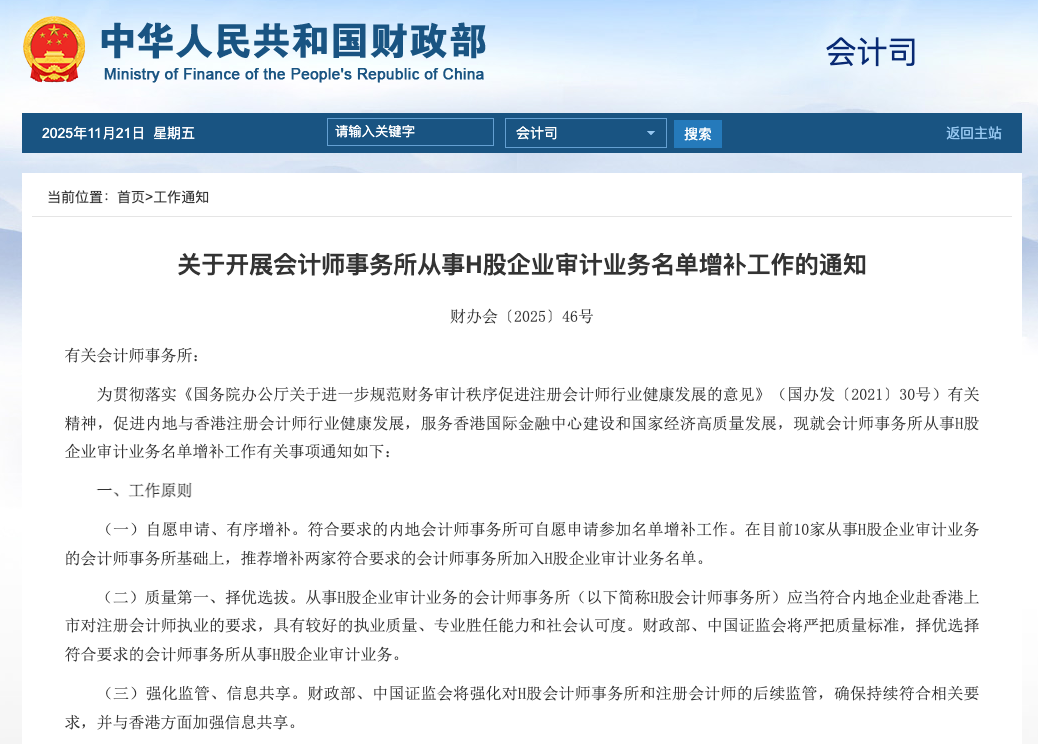 财政部11月21日发布消息称,为贯彻落实《国务院办公厅关于进一步规范财务审计秩序促进注册会计师行业健康发展的意见》(国办发〔2021〕30 号)有关精神,促进内地与香港注册会计师行业健康发展,服务香港国际金融中心建设和国家经济高质量发展,近日,财政部、中国证监会联合印 发了《关于开展会计师事务所从事H股企业审计业务名单增补工作的通知》(财办会〔2025〕46号,以下简称《通知》)。《通知》规定了工作原 则、申报要求、申请材料、工作程序和监管要求等。 据了解,2010年12月份,财政部、中国证监会在与香港监管机构充分协商的基础上,向香港监管机构推荐了12家可从事H股企业审计业务的内地会 计师事务所(以下简称"H股会计师事务所"),分别为:立信、天健、立信大华(后更名为大华)、信永中和、安永华明、国富浩华、京都天华 (后更名为致同)、普华永道中天、德勤华永、毕马威华振、中瑞岳华(后更名为瑞华)、大信会计师事务所。获推荐的12家H股会计师事务所可 为在香港资本市场上市的符合条件的H股企业出具审计报告。这一机制实施十余年来,有效降低了内地企业赴港上市交易成本,在深化两地会计交 流合作、促进两地资本市场互联互通方面发挥 ...