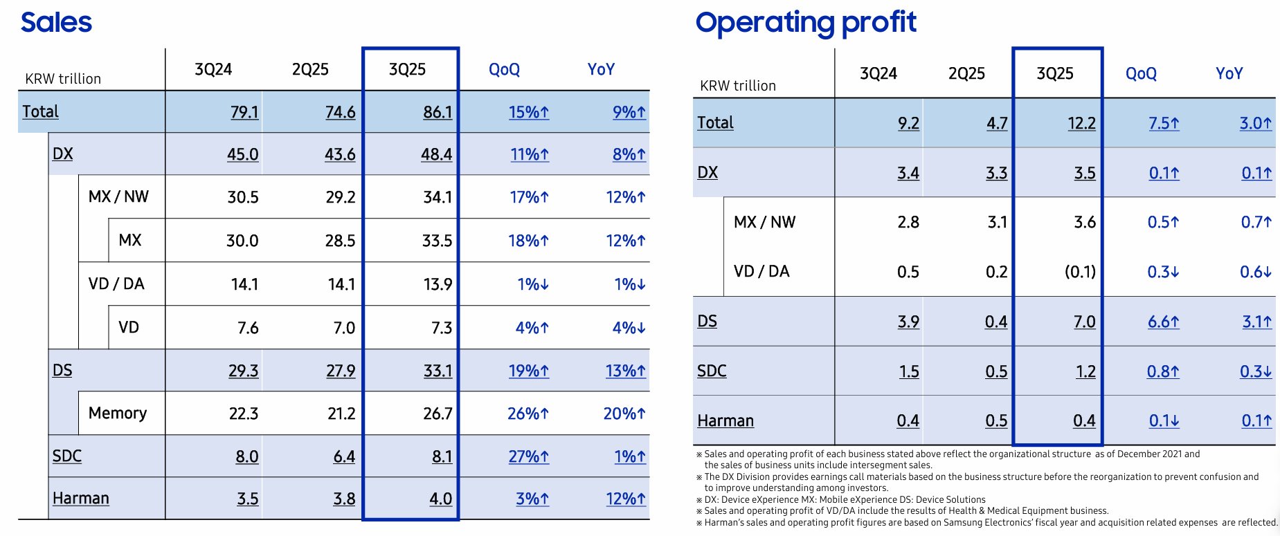 三星电子(SSNLF.US)半导体部门第三季度利润大幅超出预期,显示出全球人工智能(AI)需求正在推动这家韩国企业最重要业务板块的复苏。 三星电子周四公布的财报显示,该公司第三季度销售额为86.1万亿韩元,同比增长9%;营业利润为12.2万亿韩元;净利润为12.0万亿韩元,高于分析师平均预 期的9.3万亿韩元。 主要负责半导体业务的DS部门(设备解决方案部门)第三季度销售额同比增长13%至33.1万亿韩元,其中存储芯片销售额同比增长20%至26.7万亿韩元;该部门 第三季度营业利润为7.0万亿韩元,较上年同期的3.9万亿韩元增长了79%,远高于分析师平均预期的4.7万亿韩元。 值得一提的是,SK海力士第三季度营业利润为11.4万亿韩元(约合80亿美元),创历史新高,略高于分析师预期的平均值;销售额达24.5万亿韩元。该公司还透 露,明年全系列存储芯片订单已售罄,这表明全球人工智能基础设施的建设正在大幅提升整个行业的需求。 投资者正押注三星电子有望凭借规模优势在高带宽存储(HBM)市场重新夺回份额。据研究机构Counterpoint称,在AI相关投资推动下,通用型DRAM和 NAND产品的价格和销量双双上升,三 ...