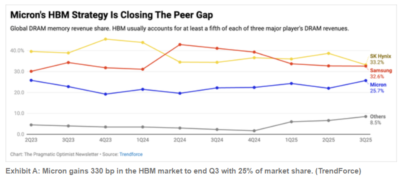 随着美光科技(MU.US)将于美东时间12月17日美股盘后(北京时间12月18日早间)公布2026财年第一季度财报,市场逐渐浮现出一个疑问:HBM(高带宽内存) 究竟是否跟过去的传统存储芯片一样是一种周期性商品?这个问题的答案,可能将决定美光自今年4月以来增加的2000亿美元市值是否合理,而本周的Q1财 报,或将成为这家美国存储巨头的"试金石"。 华尔街预计,美光本季度每股收益将达3.93美元,较上年同期的1.79美元大幅增长。营收预计将达到128.2亿美元,同比增长超过45%。 美光受益于存储超级周期 正当市场多空双方就HBM是否具有周期性、以及美光的存储业务是否仍处于繁荣-萧条循环而激烈辩论时,该公司股价却在市场上高歌猛进。本月早些时 候,美光宣布退出其"英睿达"消费级业务,这无疑为其业务的周期性争论火上浇油,市场期待本周财报能给出更多明确答案。 目前,美光在HBM领域正"激烈角逐并领跑竞争对手"。最新数据显示,美光在HBM市场的增长优势持续扩大——市场份额较此前提升330个基点,达到 25.7%,提前实现了原计划明年达成的目标。 在2025财年,推动美光发展的核心动力就是其HBM业务的快速增长,这使得公 ...