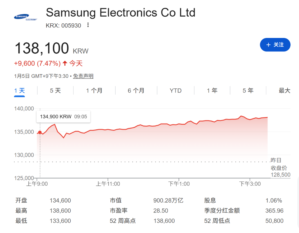 公司业绩与财务表现 - 截至12月的三个月内 三星电子初步营业利润为20万亿韩元 约合138亿美元 同比增长208% 超出分析师平均预期 [1] - 同期营收增长23%至93万亿韩元 创下历史新高 [1] - 2025年第四季度初步营业利润率达到21.5% [7] - DRAM的营业利润率在第四季度可能超过50% 并有望在2026年第一季度进一步提升 [7] 市场反应与股价表现 - 公司股价周四早盘在首尔一度上涨2.5% 延续了年初以来20%的涨势 [1] - 竞争对手SK海力士的股价上涨了6.2% [1] - 三星股价在2025年的价值已翻了一番多 本月再次飙升 [4] - 仅上周 10多位分析师就上调了三星的目标价 [4] 行业需求与市场动态 - 全球对人工智能服务器的需求大幅推高了内存芯片价格 [1] - 包括人形机器人和无人驾驶汽车在内的新兴领域需要内存 标榜人工智能功能的设备也推动了对DRAM和NAND的需求飙升 [4] - 消费电子产品的价格已经开始上涨 半导体供应方面将会出现问题 [7] - Counterpoint Research预测 本季度DDR5的价格将比前三个月上涨40% 第二季度还将再上涨20% [7] 产品结构与技术进展 - 公司受益于市场对传统DRAM 高带宽内存HBM以及NAND闪存芯片的强劲需求 [7] - 传统DRAM为公司贡献了较高的营收 [7] - 公司在全球NAND闪存芯片市场占据领先地位 有助于其在2026年实现利润增长 [7] - 公司去年向英伟达交付了其先进的HBM4样品进行认证测试 有望在今年上半年开始量产HBM4 以支持英伟达即将推出的Rubin处理器 [7] - 分析师预计 随着HBM4进入商业供应阶段 公司的HBM总出货量将在2026年增长两倍 [7]