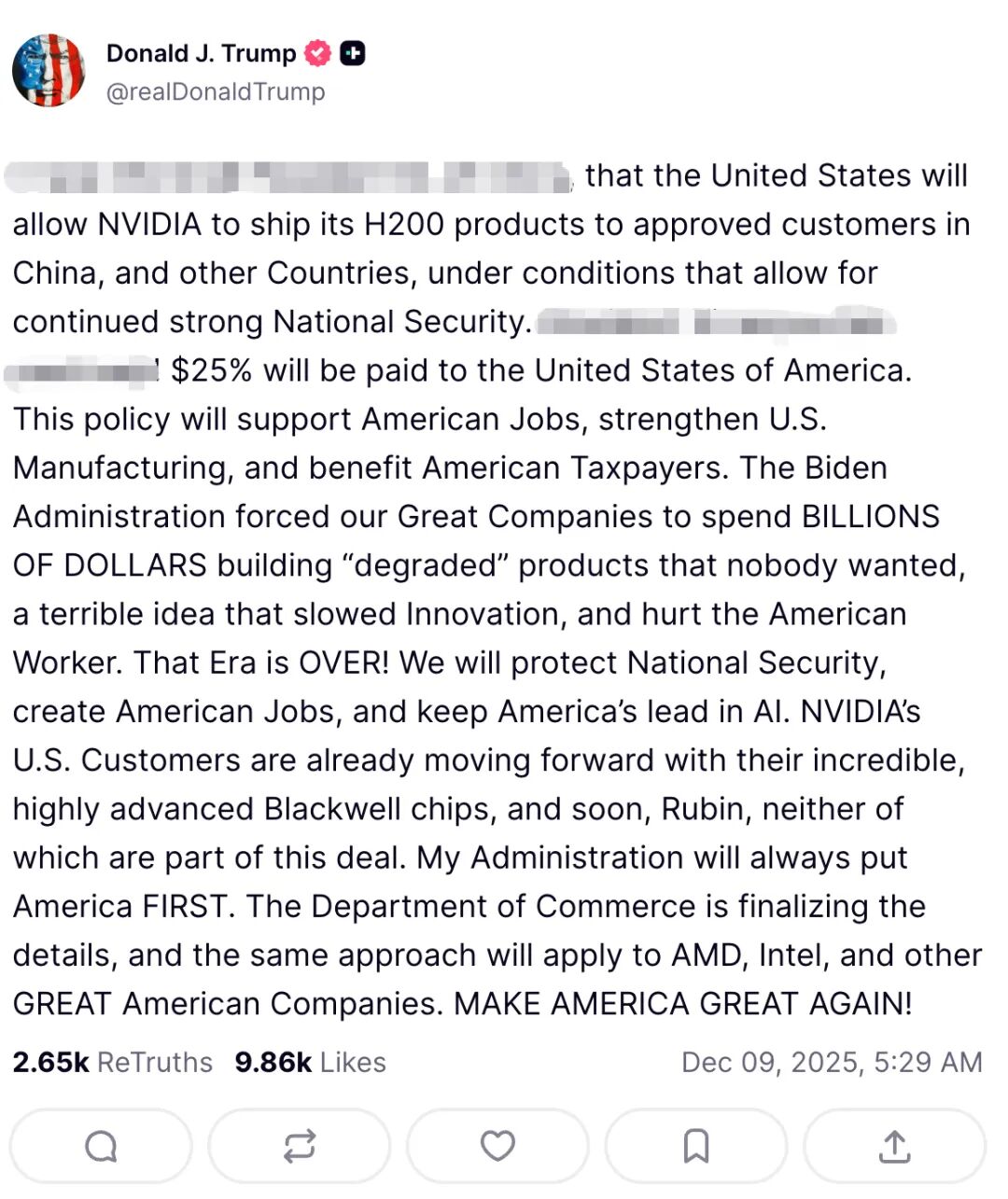 政策动态 - 美国前总统特朗普宣布将允许英伟达向中国等国的合格客户交付H200 AI芯片 前提是保障美国国家安全 且芯片销售收益的25%将支付给美国政府[1] - 该政策原则同样适用于AMD、英特尔等其他美国芯片公司 旨在支持美国就业、增强制造业并惠及纳税人 美国商务部正在敲定细节[1] - 特朗普批评拜登政府的政策强迫公司花费数十亿美元生产“劣化”产品 阻碍创新并损害美国工人利益 宣称将结束该时代以保护国家安全并保持美国在AI领域的领先地位[1] 产品与技术 - H200是英伟达于2023年11月发布的上一代旗舰AI芯片 其理论AI算力约为特供中国市场的H20芯片的13倍以上 单卡带宽比H20高45%以上[2] - 在处理大模型训练等密集计算任务时 H200相比H20具有明显优势[2] - 英伟达在售旗舰芯片为Blackwell系列 下一代旗舰芯片Rubin系列目前仍未被允许销售[1] 市场与销售状况 - 2024年英伟达Hopper系列芯片全球最大买家为微软、字节跳动、腾讯、Meta、亚马逊、xAI和谷歌 其中微软采购48.5万枚 字节跳动和腾讯各采购23万枚[2] - 2024年中国市场英伟达H20系列芯片出货量保守估计约为60万-80万枚 同期某主流国产AI芯片出货量约为30万-40万枚 英伟达2024年在中国市场份额远超60%[4] - 英伟达2025财年在中国大陆市场收入为171亿美元 同比增长66% 但该市场在其总营收中的占比已连续三年下滑至13.1%[4] - 2025年4月后 由于许可证未实际发放 已无合规的英伟达芯片进入中国市场 英伟达数据中心AI芯片在中国市场份额因此下降[3] - 英伟达创始人黄仁勋表示 由于美国出口管制 公司已100%退出中国市场 市场份额从95%降至0%[3] 公司行动与行业影响 - 英伟达中国发言人认为向商业客户供应H200是值得肯定的举措[2] - 英伟达在中国仍保持巨大投入 拥有庞大工程师团队 帮助中国科技公司在合规芯片上适配国产大模型以发挥其性能[4] - 美国政府的出口管制政策存在两难 既担心倒逼中国自主AI芯片成长壮大 又担心管制不严使中国利用美国芯片发展AI能力[5] - 中国科技公司研发可自主替代的AI芯片是坚定不移的战略 尽管购买英伟达旗舰芯片有助于降低算力成本[5]