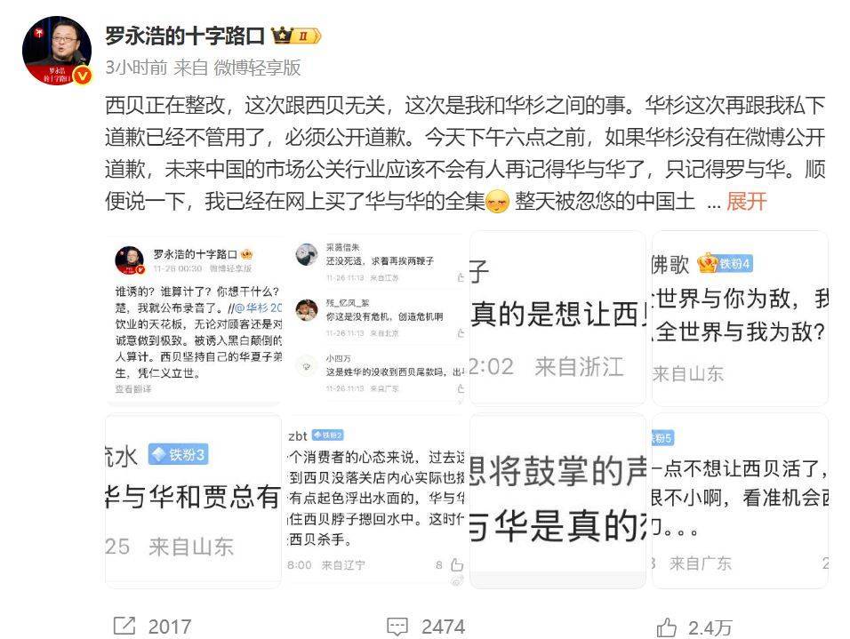 罗永浩还表示,其已经在网上买了华与华的全集。整天被忽悠的中国土老板们,其实赚钱很不容易,也该有人 给他们上一点营销防诈课了。 事件缘起华杉昨日在微博再次点评西贝事件。 11月25日,西贝品牌顾问、华与华创始人华杉发文称,"西贝是中国餐饮业的天花板,无论对顾客还是对员 工,都是诚心诚意做到极致。被诱入黑白颠倒的网络罗刹国,被人算计。西贝坚持自己的华夏子弟精神,不苟 且偷生,凭仁义立世。" 对此,26日凌晨罗永浩转发并回应:"谁诱的?谁算计了?你想干什么?你要是说不清楚,我就公布录音 了"。 在罗永浩回怼后,华杉微博开启一键防护,被网友评论为想打又打不过。 公开资料显示,华与华是西贝品牌顾问, 2002年,华杉与弟弟华楠共同创办华与华营销咨询有限公司。 根据 华杉此前发布的微博,华与华和西贝从2013年便开启了合作。据华与华微信公众号称,其为西贝莜面村打造了 超级符号"I♥莜",推动了西贝莜面村品牌系统整体升级;为西贝设计"闭着眼睛点,道道都好吃"的产品策略, 甚至推动西贝将100多道菜品精简到44道;西贝亲嘴打折节创意也是来自华与华。 11月26日,罗永浩在其个人微博发文表示,西贝正在整改,这次跟西贝无关,这次 ...
