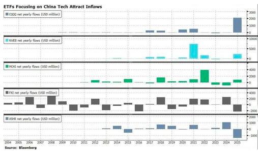 随着数以十亿美元计的资金在今年"用脚投票",美国投资者似乎逐渐"迷上"了中国科技自强的愿景,而 这种热情目前仍有望延续至新的一年。 根据业内汇总的数据显示,2025年迄今,专注于中国科技股的美国主要上市ETF已吸引了大 量资金流入,反观那些聚焦非科技板块的基金则遭遇了资金流出。 按管理资产规模计,在美上市最大中国股票ETF——KraneShares中国海外互联网 ETF(KWEB)今年以来已累计吸金23亿美元,有望创下2021年以来最佳年度表现。 资产规模排名第四的景顺中国科技ETF(CQQQ)也录得21亿美元资金流入,有望创下历史最佳年度表 现。 他补充道,DeepSeek的R1模型同时"表明中国已成为人工智能领域的真正竞争者","投资者对该主题的 兴趣应持续至2026年"。 凯投宏观首席经济学家Neil Shearing也指出,"多数发达经济体在人工智能竞赛中都难以跟上美国的步 伐,但2025年也是中国缩小部分差距之年。"他补充道,股票投资者似乎正押注于中国"在科技前沿领域 将更广泛地超越美国"。 花旗集团也持类似观点。该行经济学家在上周五发布的一份报告中写道,中国在模型和硬件方面都在迅 速赶上技术前沿。 ...