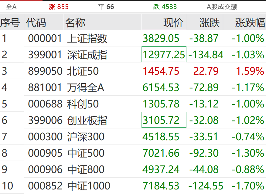 【导读】汽车板块盘初走强,零售股火热;军工、传媒板块不振,博纳影业(001330)两日跌停 大家好!一起关注最新的市场行情和资讯~ 12月16日,上午市场震荡走低,截至发稿,三大指数均跌超1%,超4500只个股下跌;北证50指数逆市飘红。 | 全A | + 66 | 跌 4533 A股成交额 | | --- | --- | --- | | 序号 代码 | | 现价 涨跌 涨跌幅 | | 1 | | 3829.05 -38.87 -1.00% | | 2 | 399001 深证成指 | 12977.25 -134.84 -1.03% | | 3 | 899050 北证50 | 1454.75 22.79 1.59% | | ব | 881001 万得全A | 6154.53 -72.89 -1.17% | | 5 | 000688 科创20 | 1305.78 -13.12 -1.00% | | 6 | 399006 创业板指 | 3105.72 -32.08 -1.02% | | 7 | 000300 沪深300 | 4518.55 -33.51 -0.74% | | 8 | 000905 中证500 | 7 ...