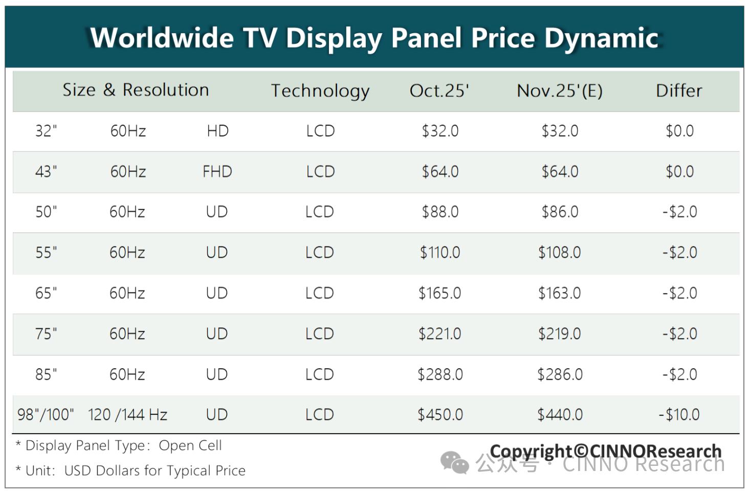 11月电视面板行情: 短期需求走弱,多规格LCD TV面板价格普降