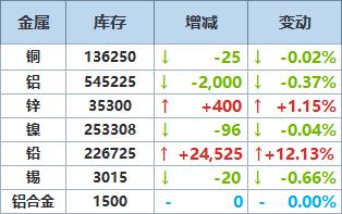 LME铜库存变动 - 总库存增加75吨至133,975吨,注册仓单为123,325吨,注销仓单为10,650吨,注销占比7.95% [1][3] - 昌雄仓库库存增加150吨至52,750吨,注销仓单2,475吨,注销占比4.69% [3] - 光阳仓库库存维持38,925吨不变,注销仓单4,025吨,注销占比10.34% [3] - 新加坡仓库库存维持7,225吨不变,注销仓单1,875吨,注销占比25.95% [3] LME铝库存变动 - 总库存减少2,125吨至550,450吨,注册仓单为506,950吨,注销仓单为43,500吨,注销占比7.90% [1][5] - 巴生港仓库库存减少2,125吨至359,250吨,注销仓单42,325吨,注销占比11.78% [5] - 鹿特丹仓库库存维持3,575吨不变,注销仓单1,125吨,注销占比31.47% [5] - 的里雅斯特仓库库存维持50吨不变,注销仓单50吨,注销占比100.00% [5] LME锌库存变动 - 总库存增加175吨至34,000吨,注册仓单为29,700吨,注销仓单为4,300吨,注销占比12.65% [1][9] - 新加坡仓库库存减少25吨至30,175吨,注销仓单4,275吨,注销占比14.17% [9] - 香港仓库库存增加200吨至2,025吨,无注销仓单 [9] LME铅库存变动 - 总库存减少3,925吨至208,600吨,注册仓单为101,950吨,注销仓单为106,650吨,注销占比51.13% [1][7] - 新加坡仓库库存减少3,925吨至206,675吨,注销仓单106,625吨,注销占比51.59% [7] - 巴塞罗那仓库库存维持25吨不变,注销仓单25吨,注销占比100.00% [7] LME锡库存变动 - 总库存增加80吨至2,940吨,注册仓单为2,805吨,注销仓单为135吨,注销占比4.59% [1][11] - 巴生港仓库库存增加80吨至2,020吨,注销仓单110吨,注销占比5.45% [11] LME镍库存变动 - 总库存增加378吨至253,128吨,注册仓单为246,588吨,注销仓单为6,540吨,注销占比2.58% [1][13] - 新加坡仓库库存增加402吨至71,460吨,注销仓单678吨,注销占比0.95% [13] - 巴尔的摩仓库库存维持108吨不变,注销仓单102吨,注销占比94.44% [13]