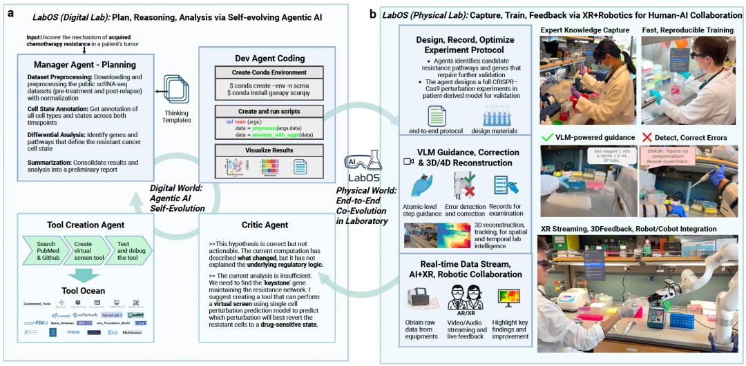 文章核心观点 - 由斯坦福大学和普林斯顿大学华人团队开发了名为LabOS的AI-XR Co-Scientist平台,该平台融合人工智能与扩展现实技术,旨在通过智能感知与虚实交互重新定义科学研究的边界,使AI能够“看见”并与人类科学家协作[2][3][6] - LabOS是首个将计算推理与真实实验相结合的AI协作科学家,通过多模态感知、自进化AI智能体以及XR支持的人机协作实现目标,能将真实实验室转变为人类和机器发现共同演进的智能协作空间[6][7] - 该平台展示了从癌症免疫疗法靶点发现到干细胞工程等各类应用中的潜力,标志着实验室进入人机协作的新纪元,未来有望成为每个实验室的“标准配置”[7][29] LabOS平台架构与核心功能 - LabOS核心由四类AI智能体组成:规划智能体负责将科学目标分解为可执行模块、开发智能体生成代码并执行复杂分析、批评智能体评估结果并优化流程、工具创建智能体从文献与数据中自主扩展工具库[9] - 该架构使LabOS能自主完成从假设生成、实验设计到数据分析的完整科研流程,并通过持续学习不断进化[12] - 在生物医学推理基准测试中,LabOS在Humanity's Last Exam: Biomedicine中达到32%的准确率,在LAB-Bench: DBQA中达到61%的准确率,领先现有模型达8%,且性能随使用时间提升[12] 视觉语言模型的技术突破 - 研究团队构建了LabSuperVision基准,包含200多个真实实验视频,由专家标注步骤、错误与参数[14] - 测试发现顶尖AI模型在协议对齐与错误识别任务中得分仅2-3分,研究团队以此训练了LabOS-VLM,通过监督微调与强化学习使模型能精准解析实验视频[14] - LabOS-VLM-235B版本在错误检测中准确率超90%,能实时识别操作错误并生成步骤指导,成为实验室视觉推理的可靠“眼睛”[14] XR眼镜实现的人机协作交互 - LabOS的湿实验模块通过扩展现实眼镜实现与人类科学家的无缝交互,研究人员佩戴轻量级AR眼镜实时传输第一视角视频至AI服务器[17] - AI每5-10秒分析视频片段,返回结构化指令包括步骤指导、错误提示和手势交互,支持语音与手势控制避免污染[17] - 系统通过多视角相机与高斯泼溅算法构建实验室的3D/4D数字孪生,支持场景回放与模拟训练,提升操作精度并将专家经验数字化[18] 实际应用场景验证 - 在癌症免疫治疗靶点发现中,LabOS分析了CRISPR激活筛选数据,通过多步推理将CEACAM6从低优先级基因提升为NK细胞抗肿瘤的关键靶点,湿实验证实其激活显著增强了肿瘤对NK杀伤的抵抗[21] - 在细胞融合机制研究中,AI智能体提出ITSN1为细胞融合调控因子,研究团队通过CRISPR干扰实验验证了其功能,展示了从假设生成到湿实验验证的闭环能力[23] - 在干细胞工程指导中,LabOS通过XR眼镜实时指导iPSC的基因编辑与慢病毒转导操作,记录专家流程并辅助新手规避常见错误,实现“AI导师”功能[25]