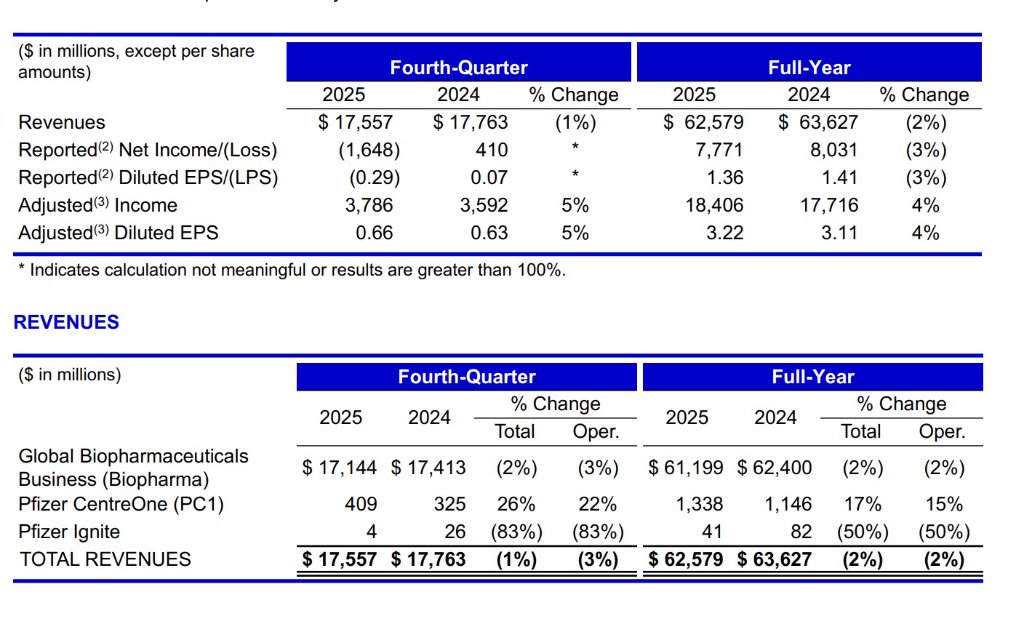 2025年全年财务表现 - 全年总营收为626亿美元,同比下降2% [1][2] - 剔除新冠相关产品影响后,核心业务组合实现6%的营业增长 [1] - 全年调整后每股收益为3.22美元,同比增长4% [1][2] - 第四季度营收176亿美元,同比下降1%;剔除新冠产品影响,季度营收同比提升9% [1][2] - 第四季度调整后每股收益为0.66美元,同比增长5% [1][2] - 全年调整后收入为184.06亿美元,同比增长4% [2] 业务板块营收分析 - 全球生物制药业务全年营收611.99亿美元,同比下降2% [3] - Pfizer CentreOne业务全年营收13.38亿美元,同比增长17% [3] - Pfizer Ignite业务全年营收0.41亿美元,同比下降50% [3] - 肿瘤业务全年营收168亿美元,同比增长8% [6] - 新冠相关产品全年营收约67亿美元,较2024年的111亿美元大幅下滑 [7] 非新冠核心产品表现 - 抗凝药物Eliquis全年营收80亿美元,同比增长8% [4] - Prevnar系列疫苗全年营收65亿美元,同比增长1% [4] - 心脏病治疗药物Vyndaqel家族全年营收64亿美元,同比增长17% [4] - 呼吸道合胞病毒疫苗Abrysvo全年营收突破10亿美元,同比增长37% [4] - 偏头痛治疗药物Nurtec ODT/Vydura全年营收14亿美元,同比增长13% [5] - 乳腺癌药物Ibrance全年营收41亿美元,同比下降6% [6] - 前列腺癌药物Xtandi全年营收22亿美元,同比增长8% [6] - 抗体偶联药物Padcev全年营收19亿美元,同比增长22% [6] - 肺癌药物Lorbrena全年营收突破10亿美元,同比增长40% [6] - 肿瘤生物类似药业务全年营收13亿美元,增长25% [6] 新冠产品表现 - 新冠疫苗Comirnaty全年营收44亿美元,同比下降18% [7] - 口服治疗药物Paxlovid全年营收24亿美元,同比下降59% [7] - 第四季度Comirnaty营收23亿美元,同比下降35% [7] - 第四季度Paxlovid营收2.18亿美元,同比下降70% [7] - 公司预计2026年新冠相关产品收入约为50亿美元 [7] 运营效率与成本管控 - 全年调整后销售成本率降至24.2%,较2024年下降1.6个百分点 [8] - 调整后的销售、信息及行政费用全年为136亿美元,同比下降7% [8] - 调整后研发费用为102亿美元,同比下降5% [8] - 全年调整后有效税率为12.7%,较2024年下降1.8个百分点 [8] - 全年向股东派发股息98亿美元,每股分红1.72美元 [8] - 全年投入104亿美元用于内部研发,约88亿美元用于业务拓展及相关交易 [8] 研发管线与战略布局 - 2025年共启动11项关键临床试验,计划2026年启动约20项关键性临床试验 [1][8] - 2025年11月完成对Metsera的收购,交易总估值约70亿美元,布局下一代肥胖症及心脏代谢疾病管线 [9] - 2026年2月公布超长效GLP-1受体激动剂PF-3944的2b期临床研究积极结果 [9] - 与YaoPharma达成独家全球合作协议,获得小分子GLP-1受体激动剂YP05002权益,协议包括1.5亿美元首付款及最高19.35亿美元里程碑付款 [9] - 2026年计划启动的关键临床试验中,有10项围绕Metsera收购的肥胖症资产展开,4项针对PD-1×VEGF双特异性抗体PF-08634404 [10] 肿瘤管线监管进展 - 2025年11月,美国FDA批准抗体偶联药物Padcev联合pembrolizumab用于不适合含顺铂化疗的肌层浸润性膀胱癌患者的围手术期治疗 [11] - 2025年12月,EV-304研究中期分析显示Padcev联合pembrolizumab已达到无事件生存期与总生存期双重主要终点 [11] - HER2CLIMB-05三期试验数据显示,Tukysa作为HER2阳性转移性乳腺癌的一线维持治疗方案,可降低疾病进展或死亡风险达35.9% [11] - 2026年1月,BREAKWATER研究数据显示,Braftovi联合方案用于BRAF V600E突变型转移性结直肠癌治疗,客观缓解率达到64.4% [12] 2026年业绩指引 - 预计2026年全年营收将在595亿至625亿美元区间 [13] - 预计2026年调整后每股收益为2.80至3.00美元 [13] - 营收指引包含约50亿美元新冠相关产品收入及约15亿美元专利到期负面影响 [13] - 预计全年调整后销售及行政费用约为125亿至135亿美元,研发费用预计为105亿至115亿美元,调整后有效税率约15% [13] - 2026年不计划进行股份回购,财务策略以降低负债水平和保持资本结构平衡为核心 [13]