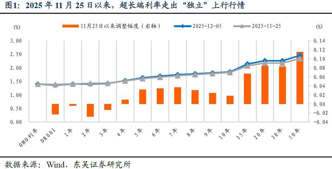 超长端利率独立上行行情 - 2025年11月25日TL2603合约成为主力合约后,截至12月5日,30年期超长端利率累计上行8.3bps,50年期上行11.55bps,而同期10年期利率仅上行1.8bps,3年期以内短端利率有不同幅度下行 [1] - 在此轮行情带动下,30年与10年期限利差快速走扩至41bps [1] 市场对货币政策基调的误读 - 市场将中国人民银行行长潘功胜文章中“要始终保持货币政策的稳健性”解读为货币政策基调将从“适度宽松”转向“稳健”,导致对“降准降息”预期降温 [3] - 分析指出,“货币政策体系”或“货币政策框架”表述为“科学稳健”,并不直接等同于“政策基调”或“政策立场”的改变 [3] - 货币政策措辞更多是对当前状态的描述,不代表未来的操作空间,“降准降息”仍需相机抉择 [4] - 预计2025年中央政治局会议和中央经济工作会议对货币政策的表述大概率延续“适度宽松”基调 [4] 对“科学稳健的货币政策体系”的解读 - “科学稳健的货币政策体系”是金融制度基础设施,涵盖基础货币投放、市场利率调控、结构性政策工具、人民币汇率机制和货币政策传导机制等五个方面 [5] - 该提法自2024年6月陆家嘴论坛以来即已存在,并不预示货币政策取向的改变 [6] 对“收短放长”操作的正确理解 - 2025年11月以来的“收短放长”操作与2016年的含义不同,并非旨在抬升资金成本,而是不同期限流动性工具的灵活搭配 [6] - 人民银行已构建起逆回购、MLF、买断式逆回购、降准和国债买卖相结合的流动性期限框架 [6] - 2025年5月“降准降息”以来,DR001和DR007平稳运行,11月25日至12月5日DR001甚至小幅下行2.32bps [7] - 由于长期资金需求未减,7天期逆回购需求降低,3个月和6个月期买断式逆回购放量,11月净投放量达5000亿元 [7] - 同期,3个月期和6个月期AAA同业存单利率分别上行4.50bps和2.50bps [7] 超长端利率上行的驱动因素分析 - 超长端利率上行压力更多来自年末不同机构行为的综合博弈,而非货币政策转向 [8] - 银行体系面临资产端增配长久期债券与负债端存款久期缩短的矛盾,部分机构抛售超长久期债券以腾挪久期敞口,应对2026年政府债发行,或为兑现年内浮盈 [8] - 预计2026年广义财政支出继续扩张,新发政府债仍将施压银行承接能力,需要货币政策平抑利率波动 [8] - 当前超长端利率上行行情或不具备趋势性,利差显著扩张后可能吸引配置资金和交易资金买入 [8]