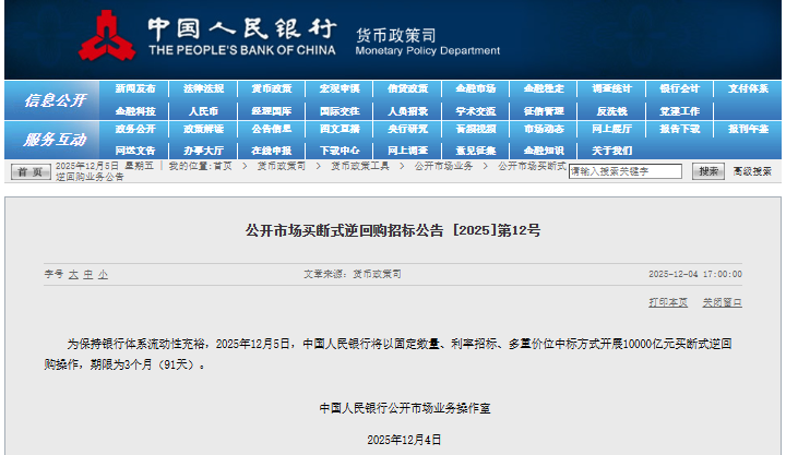 央行新操作。 12月12日,中国人民银行(下称"央行")发布公告称,将在15日以固定数量、利率招标、多重价位中标方式开展6000 亿元买断式逆回购操作,期限为6个月(182天)。本次操作后,央行在12月两个期限品种买断式逆回购实现加量续 作,为连续7个月加量续作。 "着眼于应对潜在的流动性收紧态势,央行继续通过买断式逆回购向银行体系注入中期流动性,引导资金面处于较为 稳定的充裕状态。"东方金诚首席宏观分析师王青向证券时报记者指出,10月财政部安排5000亿元地方政府债务结存 限额,这意味着12月政府债券发行规模或处于较高水平。另外,新型政策性金融工具投放完毕后,将带动配套贷款较 快增长。最后,12月银行同业存单到期量达到3.7万亿元,为年内最高水平。上述因素都会在一定程度上带来资金面收 紧效应。 近年来,央行通过各种工具的配合使用,有效应对财政税收、政府债券发行等短期波动,货币市场运行整体平稳,短 端货币市场利率围绕政策利率中枢小幅波动,银行体系流动性保持充裕。 "总体看,我国流动性工具体系已较为完整,基本覆盖了国际通行的流动性工具范围。"业内专家表示,逆回购、 MLF、国债买卖等保障日常的流动性供给,常备借 ...