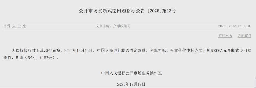 据央行公告消息,为保持银行体系流动性充裕,2025年12月15日,央行将以固定数量、利率招标、多重 价位中标方式开展6000亿元买断式逆回购操作,期限为6个月(182天)。 数据显示,因12月有4000亿元6个月期买断式逆回购到期,再开展的6000亿元买断式逆回购操作,意味 着当月6个月期买断式逆回购加量续作,加量规模为2000亿元,为6个月期买断式逆回购连续第四个月加 量续作。 此前,央行已于12月5日开展10000亿元3个月期买断式逆回购,结合当月10000亿元到期量,12月3个月 期买断式逆回购为等量续作。 业内人士分析称,综合看,12月两个期限品种的买断式逆回购合计加量续作2000亿元,加量规模较上月 减少3000亿元,为央行连续第7个月通过买断式逆回购向市场注入中期流动性。 此外,12月还有3000亿元MLF到期,央行也可能加量续作。总体上看,业内人士分析,12月央行会综 合运用买断式逆回购、MLF两项政策工具,持续向市场注入中期流动性。不过,12月买断式逆回购加 量规模较上月下降3000亿元,降至8月以来最低水平,也可能意味着12月中期流动性投放量会较此前每 月6000亿元的较高水平有所回落。 业 ...