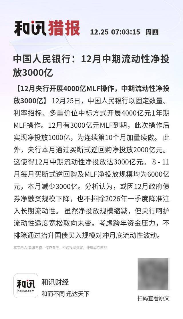 【12月央行开展4000亿MLF操作,中期流动性净投放3000亿】12月25日,中国人民银行以固定数量、 利率招标、多重价位中标方式开展4000亿元1年期MLF操作。12月有3000亿元MLF到期,此次操作后实 现净投放1000亿,为连续第10个月加量续做。此外,央行本月通过买断式逆回购净投放2000亿元。这使 得12月中期流动性净投放达3000亿元。8 - 11月每月买断式逆回购及MLF净投放规模均为6000亿元,本 月减少3000亿。分析认为,或因12月政府债券净融资规模下降,也不排除2026年一季度降准注入长期流 动性。虽然净投放规模缩减,但央行呵护流动性适度宽松取向未变。考虑跨年资金压力,不排除通过抬 升国债买入规模对冲月底流动性波动。 本文由 AI算法生成,仅作参考,不涉投资建议,使用风险自担 本文由 Al 算法生成,仅作参考,不涉投资建议,使用风险自担 和讯财经 FUL hexun.con 和而不同 迅达天下 扫码查看原文 ...