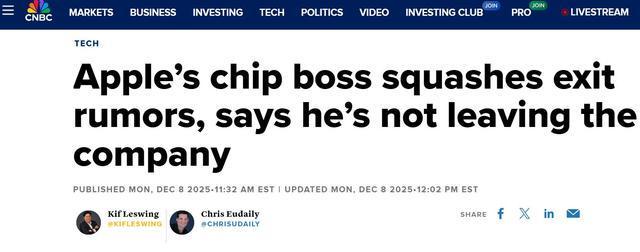 苹果芯片负责人澄清离职传闻 - 苹果公司芯片负责人约翰尼·斯鲁吉在一份内部备忘录中明确否认了近期关于其可能离职的传闻,并强调他“近期没有离开公司的打算” [1] - 斯鲁吉表示他热爱其团队和在苹果的工作,并为其团队共同打造的技术感到自豪,这些技术涵盖显示屏、摄像头、传感器、芯片、电池以及苹果所有产品中的众多其他领域 [3] 传闻背景与斯鲁吉的重要性 - 斯鲁吉的表态是对彭博社此前报道的直接回应,该报道援引知情人士消息称,斯鲁吉已向首席执行官蒂姆·库克表达过考虑离职的意向 [3] - 斯鲁吉自2008年加入苹果以来,一直领导硬件技术团队,是苹果自研芯片战略的核心人物,主导开发了iPhone所用的A系列芯片、Mac电脑搭载的M系列芯片,以及正在推进的自研蜂窝调制解调器 [3] - 他的留任对苹果至关重要,尤其是在公司加速推进软硬件深度整合与人工智能战略的关键阶段 [3] 苹果近期高层人事变动 - 在斯鲁吉发布备忘录之际,苹果高层正经历一轮显著人事变动 [3] - 过去数周内,多位高管相继宣布离职或退休:人工智能部门负责人约翰·詹南德里亚确认即将离任 [4] - 用户界面设计主管艾伦·戴伊宣布转投Meta,他曾主导iOS“Liquid Glass”视觉语言的重新设计 [4] - 总法律顾问凯特·亚当斯与环境、政策和社会事务副总裁丽莎·杰克逊亦宣布退休 [4] - 首席运营官杰夫·威廉姆斯已于今年秋季正式卸任 [4]