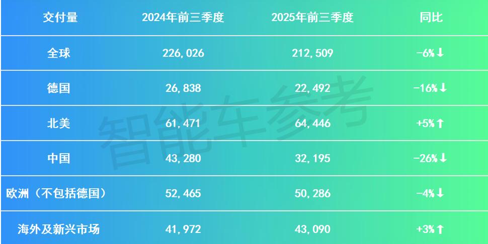 关注 「电动车公社」 和我们一起重新思考汽车 保时捷又双叒叕暴跌了! 只不过这次不是销量大幅度下滑,而是利润缩水。 最新的第三季度财报显示, 今年 1-9 月, 保时捷的 营业利润 从去年同期的 40.35 亿欧元暴跌至 4000 万欧元, 同比狂降 99%。 今天,我们就先从财报业绩开始,和大家好好分析一下。 保时捷2025年利润暴跌,对咱们这些吃瓜群众来说,可能并不算意外。 一个客观事实是, 保时捷在中国早就卖不动了! 01. 真凶是谁? 2024 年,保时捷中国交付量同比下滑28%; 到了今年1-9月,保时捷中国交付32195台车,同比下滑 25.6%, 两年的时间里几乎腰斩。 | Units | Q1-Q3 2025 | Q1-Q3 2024 | | --- | --- | --- | | Germany | 22,492 | 26,838 | | Europe without Germany | 50,286 | 52,465 | | North America® | 64,446 | 61,471 | | China4 | 32,195 | 43,280 | | Overseas and Emer ...