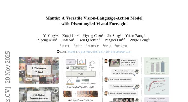 文章核心观点 - 针对当前视觉-语言-动作模型在训练中存在视觉输入与动作信号不匹配、高维视觉冗余信息干扰动作生成、以及训练后丢失语言理解能力等问题,提出了一种名为Mantis VLA的新模型架构[6][8][9] - 该模型通过**解耦视觉预测**、**渐进式预训练**和**自适应时序集成**三大核心技术,旨在减轻主干网络负担,提升动作生成的准确性与效率,并保留模型的语义理解与泛化能力[7][10][14] - 实验表明,Mantis在LIBERO基准测试中取得了最高的平均成功率96.7%,在真机实验中展现出优异的指令跟随与泛化能力,同时其自适应时序集成策略将推理成本降低了近50%[16][18][20][21] 研究背景与问题 - 当前VLA模型依赖低维稀疏的动作信号去监督高维密集的视觉输入,以训练十亿参数级的主干网络,这种不匹配导致模型表征能力未被充分利用[6] - 引入视觉预测机制时,高维视觉状态中的大量冗余信息会分散模型对动作预测的注意力,导致下游微调训练成本高、收敛速度慢[8] - 现有方法在机器人数据上训练后,往往忽视对主干网络的语言监督,导致模型丢失原有的语言理解与推理能力,难以完成复杂任务[9] 方法架构:Mantis VLA - **解耦视觉预测**:引入独立的扩散DVF头与隐式动作查询,通过类似残差连接的结构让模型仅需捕捉帧间差异来重建未来帧,从而自动提取隐式动作,为动作生成提供针对性指导,减轻主干网络负担[10][13] - **渐进式预训练**:分阶段引入视觉、语言和动作模态进行训练,避免模态间竞争,实现稳定优化,并引入额外多模态数据以保留主干模型的语义理解与推理能力[7][10] - **自适应时序集成**:在推理阶段,动态判断图像中与指令相关的物体区块和视觉特征变化区块是否重叠,仅在需要精细操作时启用计算开销较高的时序集成,否则仅执行动作分块,以此平衡运动稳定性与计算成本[7][14] 实验性能分析 - 在LIBERO基准测试的4项任务中,Mantis在3项上表现更优,并取得了最高的平均成功率**96.7%**,优于其他基线方法如UnifiedVLA的95.5%和F1的95.7%[16][18] - 在LIBERO spatial任务上,与UnifiedVLA等传统视觉预测方法相比,Mantis的收敛速度显著更快[18] - 真机实验显示,在包含域内和域外指令的任务中,Mantis在指令跟随和泛化能力上均优于对比方法,后者对域外指令几乎无泛化能力[20] - 自适应时序集成策略在保持性能的前提下,将推理次数降低了近**50%**[21] 团队与资源 - 研究团队来自上海交通大学Deng Lab,由邓志杰助理教授领衔,团队规模包括4名博士生、11名硕士生及若干科研助理[23] - 实验室与清华大学、中国人民大学、UCSD等国内外知名团队保持合作,已在TPAMI、ICML、CVPR等顶级会议期刊发表近50篇论文,相关技术已应用于美团LongCat、阶跃星辰NextStep等业界系统[23] - 团队承担多项国家级及企业合作项目,拥有超过100张GPU的高性能计算资源[23]
