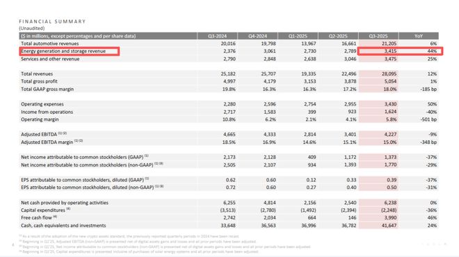 公司整体财务表现 - 2025年第三季度总收入为281亿美元,同比增长12%,创下纪录 [1] - 2025年第三季度自由现金流为40亿美元,创下纪录 [1] - 2025年第三季度总营收为280.95亿美元,高于去年同期的251.82亿美元 [3] - 2025年第三季度运营收入为16.24亿美元,同比增长40% [3] - 2025年第三季度GAAP净利润为13.73亿美元,同比下降37% [3] 能源与储能业务表现 - 能源与储能业务收入为34.15亿美元,同比增长44% [2] - 储能产品装机量达到12.5吉瓦时,创历史新高 [4] - 储能业务毛利为11亿美元,创下新纪录 [4] - 位于上海的超级工厂是特斯拉的全球出口中心,持续支撑亚太市场扩张和业务增长 [3] 产品与技术发展 - 2025年9月发布新一代工业储能产品Megablock,该产品是预先设计的中压成套设备,包含四台Megapack 3储能系统 [8] - Megapack 3计划于2026年在休斯顿超级工厂启动量产,年产能最高可达50吉瓦时 [8] - 在美国推出“太阳能 + Powerwall”租赁新方案,月付金额低于贷款购买所需还款额,并提供售后保障,五年后消费者可自主选择是否购买 [10] 行业趋势与机遇 - 公司看好人工智能产业发展带来的能源产品需求增长 [10] - 超大规模企业与公用事业公司已认识到Megapack产品能提升供电可靠性,缓解电网压力,为数据中心提供稳定供电 [10]