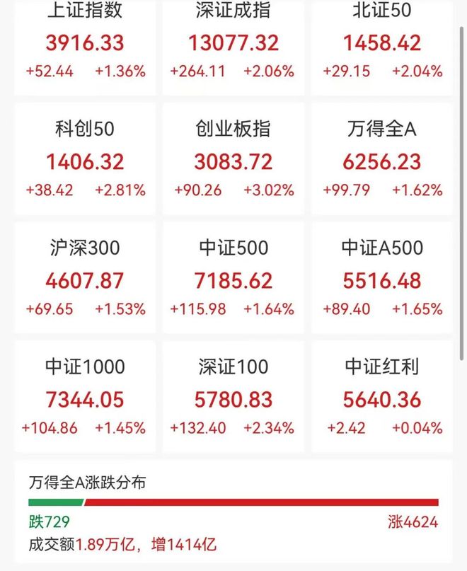 记者丨黎雨桐 编辑丨江佩霞 10月21日,A股三大指数集体上涨,截至收盘,上证指数涨1.36%,深证成指涨2.06%,创业板指涨3.02%,北证50涨2.04%。沪深京三市全天 成交额18927亿元,较上日放量1414亿元。全市场超4600只个股上涨。 | 上证指数 | 深证成指 | 北证50 | | --- | --- | --- | | 3916.33 | 13077.32 | 1458.42 | | +52.44 +1.36% +264.11 +2.06% +29.15 +2.04% | | | | 科创50 | 创业板指 | 万得全A | | 1406.32 | 3083.72 | 6256.23 | | +38.42 +2.81% +90.26 +3.02% +99.79 +1.62% | | | | 沪深300 | 中证500 | 中证A500 | | 4607.87 | 7185.62 | 5516.48 | | +69.65 +1.53% +115.98 +1.64% +89.40 +1.65% | | | | 中证1000 | 深证100 | 中证红利 | | 7344.05 | 5780. ...