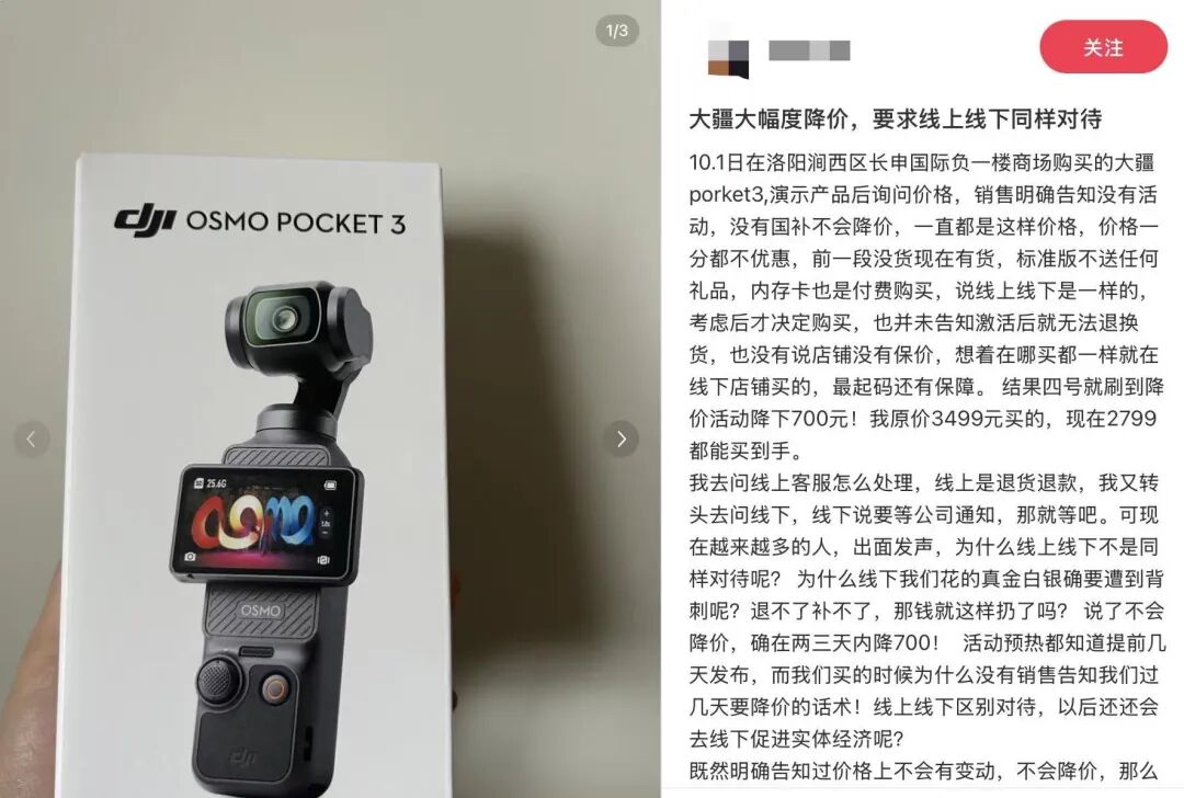 10月9日,话题"大疆"登上微博热搜,消费者围绕大疆旗下多款产品降价展开激烈讨论。 日前,大疆在官网及多个电商平台官方旗舰店挂出促销信息,多款产品价格直降数百至上千元,涉及云台相机、运动相机、手持稳定器等。 同时,客服指出,大疆产品支持试用。用户在激活使用过程中可以撕开产品塑封,但需保持外包装完好,避免丢弃或损坏。此外,自签收次日起30天内, 如产品或配件未出现损坏或明显划痕,均可申请退货。 不过,记者注意到,一些线下消费者面临退货退款难的问题。有消费者发帖表示,一些线下店铺没有"价保"政策;也有一些线下门店仅对7天内购买的消 费者退差价。另外,不少消费者强调,在店内购买时,曾特意询问店员是否有优惠,店员表示不会有任何活动包括国补;同时也未提及价保和试用政策。 在他们看来,线下购入完全是"大冤种",品牌突然大幅度降价,线上线下(300959)还区别对待。 针对消费者关注的线下差异问题,大疆方面回应记者称,公司也注意到由此引发的关注与讨论,也高度重视每一位用户的反馈。目前正通过各个渠道积极 沟通,为用户提供清晰指引与必要支持。 有知情人士透露,由于线上平台与线下经销商在运营模式、成本结构等方面存在客观差异,品牌 ...