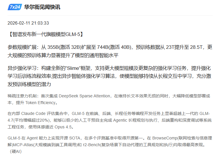 中国AI大模型技术进展 - 智谱官方确认其新模型GLM-5即为此前在OpenRouter平台登顶热度榜首的神秘模型"Pony Alpha",该模型已在chat.z.ai平台上线 [1] - DeepSeek对其模型进行了更新,网页端和APP端新版本支持最高1M(百万)Token的上下文长度,相比去年8月发布的DeepSeekV3.1的128K上下文长度有大幅提升 [1] - MiniMax的M2.5模型即将正式上线,目前已在海外MiniMax Agent产品中进行内测 [1] 字节Seedance2.0视频大模型的技术突破 - Seedance2.0能够根据一句简单提示词(如“孙悟空大战哈利波特”)生成电影级运镜、多镜头切换且保持一致性,无需用户精确描述运镜细节 [2] - 模型能理解简单提示词背后的逻辑,例如在生成内容中精准加入“吃俺老孙一棒”经典台词并运用孙悟空分身术等元素 [2] - 模型在声画一致性上表现出色,口型能分别对应中英文,解决了AI视频在运镜、一致性、声画情绪同步等关键难题 [2] - 尽管生成的视频仍存在瑕疵(如角色位置错误),但仅使用简单提示词已达到惊艳效果,通过更精细的提示词和分镜有望实现精准“调教” [3] Seedance2.0对行业生产力与成本结构的颠覆 - 技术标志着AIGC“童年时代”的结束,将终结旧有的成本逻辑和生产力体系 [3][4] - 视频制作门槛被极大降低,使“视频全民化、互动化”成为可能,推动进入“全民视频导演”时代 [4] - 视频生产成本急速下降、效率指数级提升,预计将引发“内容领域史无前例的通货膨胀”,并彻底重构短剧、动漫、广告、游戏等行业 [4] - 技术效果过于逼真导致真实与伪造界限模糊,已限制真人人脸上传以应对可能混淆现实的风险 [4] AI视频时代的内容创作核心 - 当技术使所有人都能调用电影级画面时,真正的行业壁垒将转向思考、好故事和独特的审美 [5][6] - 技术可以追赶人类的想象力,但想象力本身永远是稀缺资源 [6]