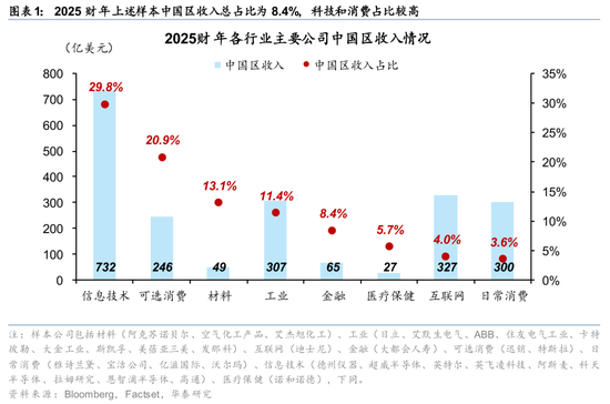 核心观点 - 内需修复仍在进行中,科技进展和悦己消费是结构亮点 [1][78] - 总量维度看,45%的企业认为4Q25业绩有所改善,33%企业预期未来进一步改善 [1][79] - 拖累本季度增长的共性因素依然是房地产及因此带来的需求偏弱 [1][79] - 结构上不乏亮点:科技进展明显,部分传统企业受益于科技需求;服务消费和悦己消费逆势增长 [1][79] 总览 - 2025财年样本公司中国区收入总占比为8.4% [1][79] - 信息技术、可选消费两大行业的中国区收入占比超过20% [1][79] - 样本内45.2%的跨国企业中国区收入4Q25有所改善,29%持平 [1][79] - 43.3%的企业管理层认为未来中国区收入可能下滑,33.3%的企业预期改善 [1][79] - 分行业看,金融、互联网、材料和日常消费对未来展望改善的预期比例相对更高,可选消费、信息技术展望略显平淡 [1][79] 内需 - 原材料及工业产品四季度依然受到地产下行拖累 [2][12] - 涂料和电梯因翻新改造前景乐观 [2][12] - 部分工业公司提及汽车等需求偏弱 [2][12] - 服务和悦己型消费热度较高 [2][12] - 上海迪士尼疯狂动物城园区是该乐园客流的核心驱动力 [2][12] - 雅诗兰黛中国大陆业绩改善引领集团业绩回升,公司更加战略性重视中国区发展 [2][12] - 宝洁称中国消费环境整体谨慎,但帮宝适与SK-II依然实现双位数增长 [2][12] - 沃尔玛电商及山姆会员店表现都较为亮眼 [2][12] 贸易摩擦 - 本地化布局是部分企业的应对之道 [2][12] - 电气设备厂商ABB称中国本土化占比高于85% [2][12] - 机械企业斯凯孚称依然高度关注中国区供应链调整压力 [2][12] - 机械企业美蓓亚三美称中国业务转向“本地开发、本地销售”的相对独立模式,不再承担集团全球制造核心职能 [2][12] 科技 - 部分传统企业受益于科技带来的增量需求 [3][13] - 空气化工产品称虽然亚洲宏观经济环境低迷,但半导体行业扩容推动电子气体业务受益 [3][13] - 机械企业发那科称中国增速较高,尤其是机器人业务 [3][13] - 中国对海外科技产品的需求略有降温 [3][13] - 阿斯麦预计2026 年中国大陆收入占比下降 [3][13] - 科天半导体预期2026年中国市场将趋于平稳 [3][13] - 拉姆研究预计中国将呈现更平稳的年增长率 [3][13] - 美国出口限制和国产替代影响海外公司在中国区收入 [3][13] - 路透社报道称Intel CPU交付时间可能拉长至6个月 [3][13] - 英飞凌称在标准化功率器件领域本土厂商竞争加剧 [3][13] - AMD称中国市场的供给高度依赖许可证审批节奏 [3][13] 分行业总结:材料与工业 - 电子气体得益于半导体产业,建材总体偏弱,但存量翻新驱动涂料需求企稳 [4][14] - 地产拖累电梯、传统电器业务下滑,但改造需求带来增量 [4][16] - 空气化工产品电子气体业务未来有望充分受益,公司在手电子气体项目丰富,预计未来一年将有更多投资 [14][26] - 阿克苏诺贝尔2025年在中国市场的建筑装饰涂料销售量实现了逆势增长,收入取得小个位数正向增长 [14][27] - AGC集团在中国区域建筑玻璃销售仍面临较大压力 [14][28] - 日立在中国区的CI业务(包括自动化、电梯)4Q25收入占比22%,仍在下滑,但对2026年更新改造需求带来的增量展望乐观 [16][29] - 卡特彼勒预计2026年中国市场将摆脱低谷、实现积极增长,尤其看好10吨以上中大挖产品的全年增长 [17][32] - 斯凯孚中国区营收增长在第四季度显著放缓至1.0% [17][33] - 大金工业2026财年Q1-Q3中国区销售额同比下降8%,但通过聚焦高附加值产品维持了22%-23%的高营业利润率 [17][35] - 发那科2025年中国区收入保持25%左右的复合增速,其中机器人业务增速在20%左右 [38] 分行业总结:消费 - 可选消费中纺服和汽车称国内市场竞争整体加剧,但依然战略性关注中国市场 [4][20] - 日常消费中美护行业增速较高,尤其是高端产品,但食品略下降 [4][21] - 迅销集团(优衣库)2025财年大中华区营收同比下降4%,成为唯一下滑区域 [20][43] - 特斯拉2025年中国区收入209.62亿美元,占公司总营收22.1%,中国区收入占中国整体汽车市场份额的4% [20][44] - 雅诗兰黛FY26H1中国大陆市场占集团整体收入约19%,中国大陆引领集团业绩回升 [21][47] - 宝洁FY26Q1-Q2大中华市场同比增速分别实现+5%/+3%,帮宝适与SK-II均实现15%以上增长 [21][50] - 亿滋国际中国市场全年实现低个位数增长 [22][52] - 沃尔玛FY26Q3中国区净销售额同比增长21.8%,电商业务净销售额同比增长32% [54][55] 分行业总结:科技硬件与半导体 - 科技硬件面临出口管制与供应链调整的挑战 [4][23] - 多数半导体公司在中国区维持较高收入占比 [4][23] - 部分公司预计2026年中国市场将趋于平稳 [4][23] - 英特尔2025年中国市场约占其全年收入的24%,但服务器CPU交付周期可能拉长至六个月 [56][57] - 英飞凌FY25大中华区收入占比提升至29%,但在标准化功率器件领域本土厂商竞争加剧 [58][59] - 德州仪器FY2025年中国地区收入占比约21% [60] - 阿斯麦4Q25中国大陆收入占比维持在36%的高位,但预计2026年占比将回归至20%左右 [62][63] - 拉姆研究4Q25中国地区收入占比35%,预计中国将呈现更平稳的年增长率,占比将逐步回落 [64][65] - 科天半导体4Q25中国地区收入占比35%,预期2026年中国市场将趋于平稳,可能略有增长 [66][67] - AMD 25Q4出口中国的MI308 GPU收入约为3.9亿美元,约占数据中心业务收入的7.2%,供给高度依赖许可证审批 [68][69] - 恩智浦2025年中国区域收入占比39%,是公司最核心的单一地区,得益于国内汽车需求相对稳定 [71] - 高通FY2025年中国地区收入占比约46%,受存