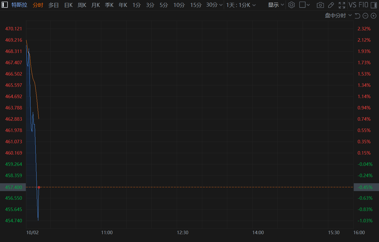 特斯拉(TSLA.US)短线下挫,日内转跌,此前一度涨超2%。特斯拉第三季度交付量497099,同比+7.4%,预估439612。Model 3/Y 交付量481166辆,同比 +9.4%,预估424828。汽车产量447450辆,同比-4.8%,预估450313。Model 3/Y 产量435826辆,同比-1.8%,预估426714。 | ■ 特斯拉 | | 分时 多日 日K 周K 月K 季K 年K 1分 | 3分 | રસ્ત્ર | 10分 | 15分 30分 v 1天:1分K v | | 显示 × ◎ | | --- | --- | --- | --- | --- | --- | --- | --- | --- | | 470.121 | | | | | | | | | | 469.216 | | | | | | | | | | 468.311 | | | | | | | | | | 467.407 | | | | | | | | | | 466.502 | | | | | | | | | | 465.597 | | | | | | | | | | 464.692 | | | | | | | | | ...