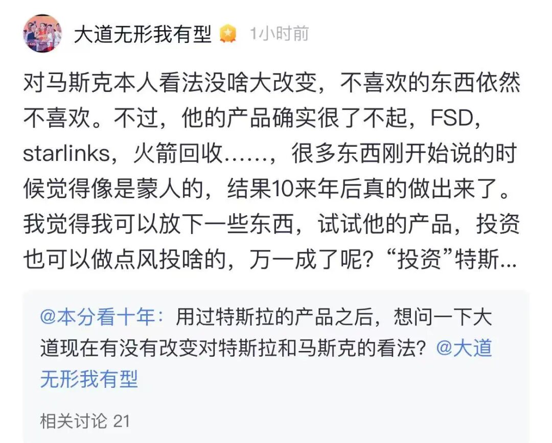 段永平对特斯拉及马斯克的看法 - 段永平对马斯克本人的看法没有改变 依然不喜欢其品行 并曾表示不想与其做朋友 即使给钱也不愿意 [1] - 段永平认为马斯克的产品非常了不起 包括FSD、Starlink和火箭回收技术 许多产品从最初被质疑到10来年后真的实现 [1] - 段永平表示可以放下一些成见 尝试使用马斯克的产品 并在投资上可以做一些风险投资类型的尝试 [1] 段永平对特斯拉的投资与产品体验 - 段永平承认其“投资”特斯拉基本是基于“市梦率” 完全靠蒙 并提醒大家好自为之 [1] - 段永平在实际体验后认为FSD确实好用 Model Y开起来没有不舒服 现在开特斯拉已是其首选 [1]