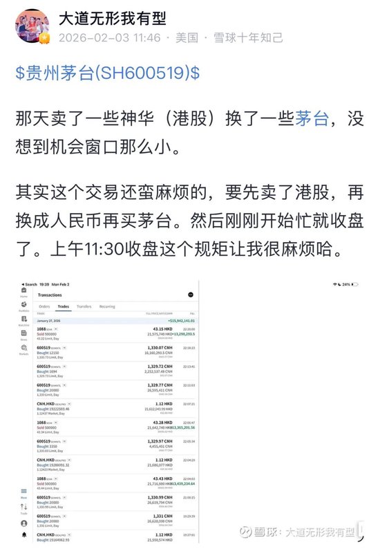 段永平近期交易操作 - 知名投资人段永平于1月27日卖出150万股中国神华H股,分三笔成交,每股价格在43.15至43.43港元之间,每笔成交额约2157万至2171万港元 [1][19] - 同日,段永平将卖出所得资金换入贵州茅台,分六笔共计买入77,194股,买入价格在1329.72至1331.00元人民币之间,总投入额约1亿元人民币 [1][19] - 段永平在2月3日发帖称此次交易窗口期很短,并提及了港股换汇再买入A股的操作复杂性 [1][19] - 此前在1月21日,段永平曾挂单1365元人民币每股的价格意图买入2万股茅台 [3][21] - 截至新闻发布时,贵州茅台股价为1524.18元人民币,近5个交易日涨幅超12%,段永平此次买入操作已实现浮盈超1000万元人民币 [4][22] 段永平对贵州茅台的核心观点 - **i茅台平台的战略价值**:认为i茅台平台通过打击假货和实现2C市场化,其价值相当于“再造了一两个茅台”,并预计一两年内就能看清其威力 [6][24][25][27] - **i茅台的具体影响**:平台单月拦截各类异常行为达5.4亿次,解决了假货对消费者心理的威胁,使销量更趋近于真实消费,其可信度和可控度大幅提高 [6][25][26] - **产品需求与开瓶率**:援引网友数据称,近期不仅i茅台申购火爆,经销商端的飞天、精品、年份酒都销售良好,需求量上升,开瓶率也变得特别高 [9][30] - **对真实需求的看法**:认为i茅台展示了茅台的真实需求,很多家庭一年消费一瓶是合理的,该平台解决的渠道问题所带来的消费群体扩大,足以弥补甚至超过因大环境改变导致的消费减少 [10][31] 段永平对茅台定价策略的观点 - **建议温和持续提价**:认为茅台有涨价能力,建议公司考虑每年温和涨价,例如每年5%-8% [7][28] - **具体提价幅度**:在与网友讨论中,认为1%的涨幅太少,至少应与通胀持平,提出每年涨价3%-5%可能更合适,强调每年温和涨价比每隔几年涨一次更好 [8][29] - **提价依据**:提价能力此前被市场价差和假货问题侵蚀,现在应探索与通胀匹配的合理涨幅 [7][8][28][29] 段永平分享的其他投资理念 - **投资本质**:认为“投资很简单,但不容易”,其中“不容易”指的是看懂生意不容易,而“简单”在于只有看懂生意是重要的 [13][34] - **持股心态**:指出当股票下跌时心里充满恐惧,说明投资了自己不懂的公司,并以茅台为例,称若不懂则股价再跌10%可能就坚持不住 [14][35] - **买入时机**:回应网友关于买入时机的问题时表示,如果知道接下来会跌,当然应该等待 [13][34] - **关于巴菲特与茅台**:提及巴菲特当年曾询问过收购茅台,但公司不愿出售 [12][33] 段永平对其他公司的看法 - **对腾讯的评论**:有网友问及腾讯闪崩,段永平以讽刺口吻回应,称“山崩地裂地掉了3%”,并指出提问者无意学习 [15][36] - **对特斯拉与马斯克的看法**:个人体验认为特斯拉的FSD好用,Model Y驾驶舒适,已成为其首选车型 [16][37] - **对马斯克产品的评价**:认为马斯克的产品如FSD、星链、火箭回收等非常了不起,许多当初看似不可能的事情在十来年后都做成了 [16][37] - **对特斯拉投资的观点**:将投资特斯拉视为看“市梦率”,基本靠蒙,属于风险投资性质 [16][37] - **对特斯拉估值的理解**:回应关于市盈率390的提问时表示,如果马斯克承诺的事情最终实现,当前的定价就不一定是错误的,并认可其过往承诺的实现记录 [17][18][38][39]