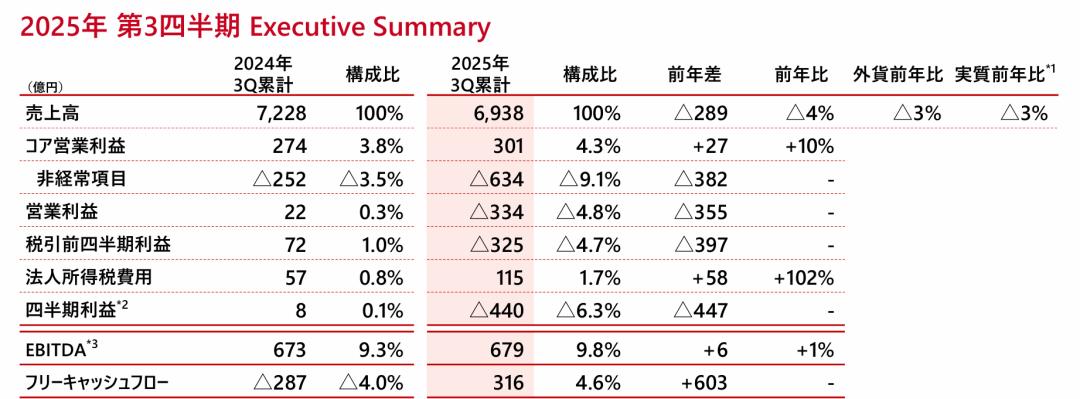 整体业绩表现 - 2025年前三季度净销售额为6938.17亿日元,同比下跌4.0% [1] - 核心营业利润为300.80亿日元,同比增长9.7% [1] - 营业利润亏损333.50亿日元,同比暴跌1627.71% [1] - 公司处于高层换血、业务重组和市场环境剧变下的动荡调整期 [1] 品牌表现 - 醉象品牌第三季度销售额同比下跌19%,前三季度同比暴跌49%,是集团旗下唯一在第三季度业绩下滑的品牌 [4][6] - Next 5潜力品牌中,ELIXIR、安热沙、Narciso Rodriguez、三宅一生香水第三季度销售额均增长,其中ELIXIR第三季度同比增长17%,前三季度同比增长14% [6] - Core 3核心品牌中,资生堂品牌、肌肤之钥、NARS第三季度销售额分别增长6%、12%、2% [7] - 在欧洲市场,Zadig&Voltaire品牌销售额同比增长超过70% [7] 区域市场表现 - 除日本市场和欧洲市场外,其余四大市场销售额均下滑,美洲市场下滑幅度最大,为-10.3% [9][10] - 中国及旅游零售市场前三季度销售额同比下滑7.6%,但第三季度单季销售额转为增长,增幅达8.1% [10][11] - 日本市场前三季度销售额同比微增0.1%,欧洲市场同比增长5.0% [10][13] - 中国市场的电子商务在肌肤之钥和NARS推动下显著增长 [12] 战略与组织调整 - 公司公布2030中期战略,目标是在2026年实现7%的核心经营利润率,到2030年核心营业利润率达到10%以上 [14] - 计划通过优化成本结构将利润率提高3%,并设定2025-2030年销售额复合年增长率高于市场2-5% [14] - 将于2026年启动新的高管与董事会架构,设立首席官与事业部官两类新职位 [16] - 董事会将迎来多位新任外部董事,旨在增强多元专业背景与独立性 [17] - 公司正推动一场聚焦高增长品类、数字化和可持续发展的全面战略与组织转型 [18]