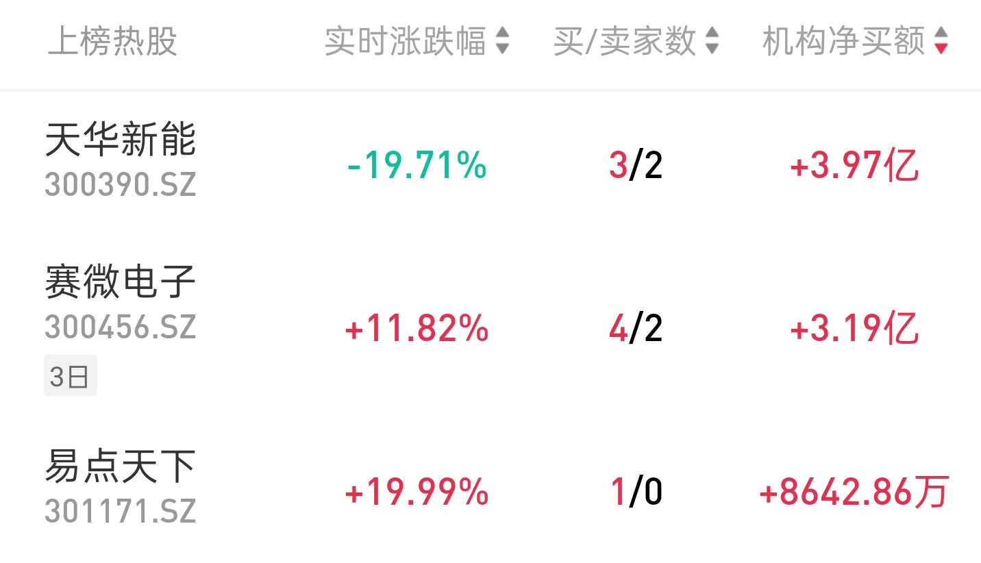龙虎榜机构热股 今天机构龙虎榜上榜39只个股,净买入13只,净卖出26只。当日机构买入最多的个股前三位是:天华新能(3.97亿)、赛微电子(3.19亿)、易点天下 (8642万) 个股龙虎榜 | 上榜热股 | 实时涨跌幅♀ 买/卖家数↕ | | | --- | --- | --- | | 天华新能 | -19.71% | 3/2 | | 300390.SZ | | | | 赛微电子 300456.SZ | +11.82% | 4/2 | | 3日 | | | | 易点天下 201171 C7 | +19.99% | 1/0 | 易点天下 龙虎榜显示,今日1家机构净买入8642万。 公司与阿里云达成AI漫剧出海框架合作协议,共同打造首个AI漫剧出海加速增长引擎。 龙虎榜知名游资 一、AI应用 视觉中国 个股龙虎榜 视觉内容与服务提供商,拥有海量的版权图片、视频等内容资源,旗下网站推出由AI驱动的全新智能搜索引擎 久其软件 国内领先的报表管理软件供应商;公司新一代大模型应用管理平台女娲 GPT 是快速集成、开箱即用的平台 ,提供大模型纳管与调优、智能体智能编排等能 力 ,已落地多个智能化场景 美东时间20日周四, ...