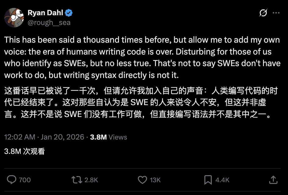 两位后端大神前后脚站出来,双双给人类编程判了"死刑"—— Node.js之父Ryan Dahl发帖引起四百万围观: 人类亲手写代码的时代已经落幕。 并非虚言,人类写代码的时代已经结束了。 Dahl在2009年一手搞出Node.js,推动了异步I/O和事件驱动编程的普及,让JavaScript从浏览器杀到服务器,改变了整个后端生态,同时这个框架也经常被 用于前端工程化工具的开发。 大佬后来又创办Deno,修正了自己当年公开承认的Node设计缺陷(如回调地狱和模块系统),目前他依然活跃在Deno项目中。 就在Dahl发文的前几天,Redis之父Salvatore Sanfilippo(antirez)也罕见发声,写了一篇《Don't fall into the anti-AI hype》,在hackernews上引起不小讨 论: 事实就是事实,编程被AI永久改变了。 这位大佬是开源界传奇人物,作为联合创始人开发了全球最流行的内存数据库之一Redis。 他发明的内存数据结构存储系统现在已经成为了全球几乎所有高并发应用(如抖音、亚马逊)的标配,是现代互联网"快"的核心动力之一。 从这两场讨论中可以看出,大家的焦点都在 ...