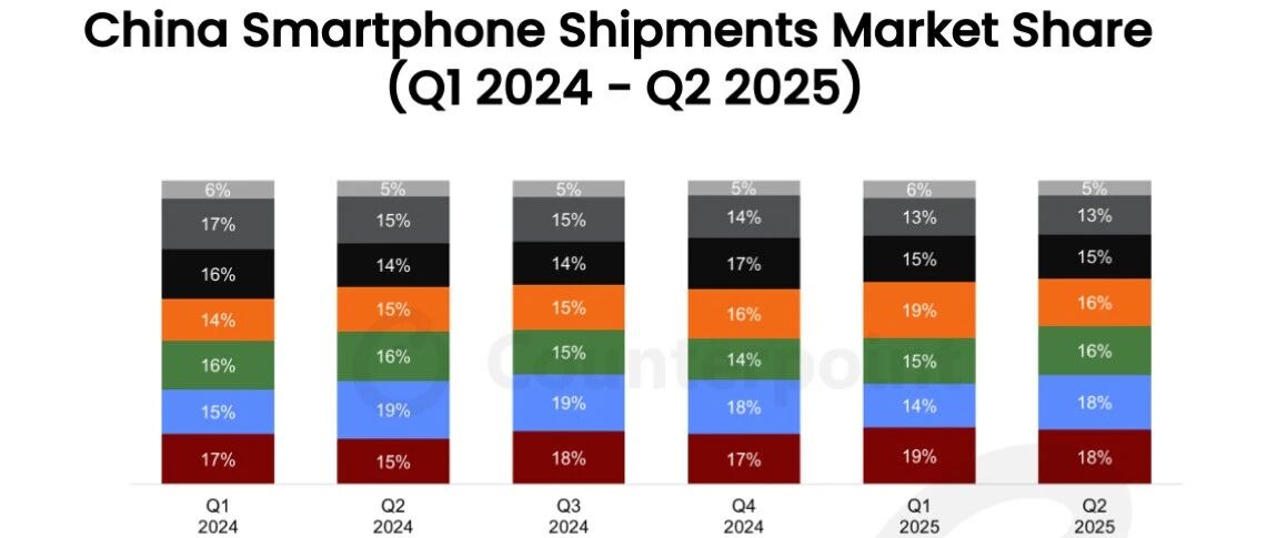 CounterPoint 报告:2025 年 Q2 中国手机出货量同比微降2%,华为、vivo 均占 18%