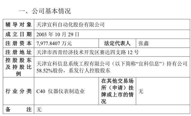 公司基本情况 - 公司全称为天津宜科自动化股份有限公司,成立于2003年10月29日 [1] - 公司注册资本为7977.8407万元 [1] - 公司注册地址位于天津市西青经济技术开发区赛达四支路12号 [1] - 公司法定代表人为张露 [1] - 公司董事长兼总经理为张鑫 [1] 公司业务与行业 - 公司主营业务为工业自动化传感器、PLC、伺服系统等核心部件的研发与销售 [1] - 公司所属行业为C40仪器仪表制造业 [1] 公司股权结构 - 控股股东为天津宜科信息系统工程有限公司,持有公司58.52%的股份 [1][2] - 公司其他投资方包括陆石投资、讯飞创投等 [2] 公司资本运作进展 - 公司已于2023年11月28日在天津证监局完成辅导备案 [1] - 本次辅导机构为国泰海通证券 [1] - 公司此前未在其他交易场所挂牌或上市 [1]