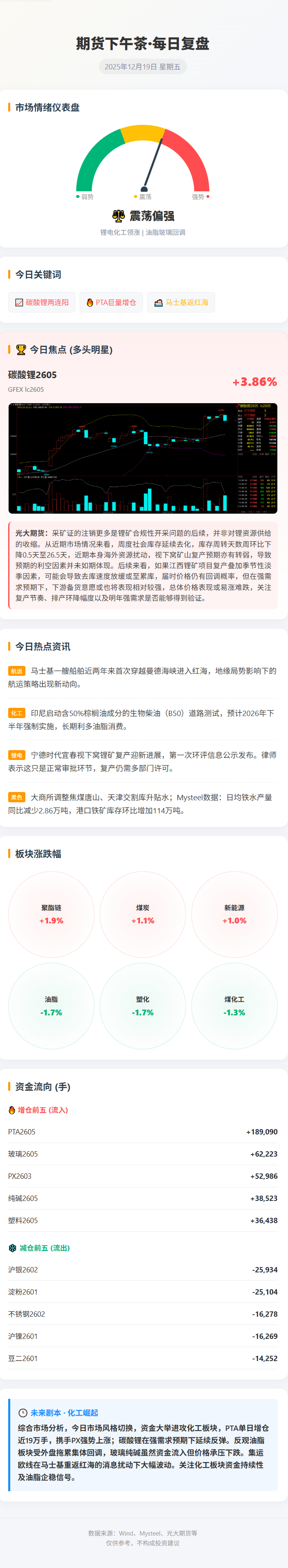 期货下午茶·每日复盘 2025年12月19日 星期五 黑色 大商所调整焦煤唐山、天津交割库升贴水;Mysteel数据:日均铁水产量 同比减少2.86万吨,港口铁矿库存环比增加114万吨。 | 市场情绪仪表盘 ● 弱势 强势 ● ● 震荡 ® 震荡偏强 锂电化工领涨 | 油脂玻璃回调 | 今日关键词 7 碳酸锂两连阳 8 PTA巨量增仓 盘 马士基返红海 | ▽ 今日焦点 (多头明星) 碳酸锂2605 +3.86% GFEX Ic2605 Home Holly Home 光大期货:采矿证的注销更多是锂矿合规性开采问题的后续,并非对锂资源供给 的收缩。从近期市场情况来看,周度社会库存延续去化,库存周转天数周环比下 降0.5天至26.5天,近期本身海外资源扰动,视下窝矿山复产预期亦有转弱,导致 预期的利空因素并未如期体现。后续来看,如果江西锂矿项目复产叠加季节性淡 季因素,可能会导致去库速度放缓或至累库,届时价格仍有回调概率,但在强需 求预期下,下游备货意愿或也将表现相对较强,总体价格表现或易涨难跌,关注 复产节奏、排产环降幅度以及明年强需求是否能够得到验证。 | 今日热点资讯 航运 马士基一艘船舶近两年来首次穿越 ...
