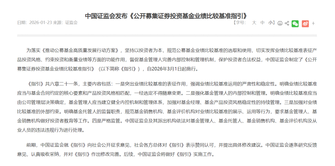 核心观点 - 中国证监会与基金业协会正式发布《公开募集证券投资基金业绩比较基准指引》及《操作细则》 旨在解决行业长期存在的业绩比较基准“用而不准、用而不实、用而不管”问题 通过强化其表征、约束、考核作用及外部监督 推动公募基金高质量发展 [1][7] - 新规自2026年3月1日起施行 存量基金将有一年左右过渡期进行调整 监管秉持“调基准不调仓”原则以防范市场冲击 [1][8] 新规核心内容 - **突出基准对产品的表征作用**:要求业绩比较基准必须充分体现产品定位、投资策略、风格及风险收益特征 确保名实相符 基准一经选定不得随意变更 不得仅因基金经理变化、市场短期变动等原因而改变 [3] - **强化基准对投资的约束作用**:要求基金管理人建立健全覆盖业绩比较基准选取、披露、监测、纠偏和问责的全流程管控机制 提高基准选取的决策层级至公司管理层 并由独立部门负责监测基金偏离情况 [4] - **发挥基准对考核的指导作用**:要求管理人建立以基金投资收益为核心的考核体系 健全与基金投资收益相挂钩的薪酬管理机制 主动权益基金长期业绩明显低于基准时 相关基金经理绩效薪酬应明显下降 同时规范基金评价评奖机制 改变全市场排名导向 [5] - **强化基准的外部监督**:对托管、销售、评价等市场机构提出要求 托管机构需履行监督复核责任 销售机构展示基金业绩时必须同步展示基准表现 信息披露环节需在基金合同、定期报告等文件中完善对业绩比较基准的披露 [6] 实施与过渡安排 - 存量产品将有一年左右过渡期进行业绩比较基准的优化变更 使其更符合基金合同约定和实际风格 [8] - 推进基准变更工作遵循“调基准不调仓”原则 尤其对规模较大、市场关注度高的产品保持重点关注 以避免集中申赎造成市场冲击 [8] - 基金业协会已建立基金业绩比较基准要素库 原则上“鼓励使用,而非必须使用” 以支持产品创新和差异化发展 [8] - 基金业协会近期将修订出台薪酬考核规则 细化基金经理薪酬考核具体指标要求 [9] 行业背景与问题 - 行业长期存在业绩比较基准与产品实际策略、风格及投资目标严重脱节的问题 未能真实反映产品的风险收益特征 [7] - 市场过度聚焦短期业绩排名 将不同类型基金放在一起比较 将基金投资异化成短期投机行为 带来投资者获得感不强、基金业绩波动过大、长期收益缺乏稳定性等问题 [7] - 此次新规是落实2025年5月7日证监会发布的《推动公募基金高质量发展行动方案》的重要举措 [7]