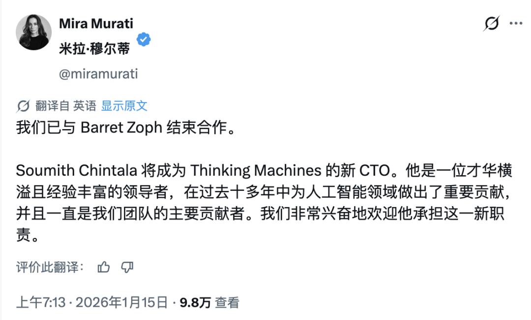 公司人事变动 - 明星AI初创公司Thinking Machines Lab解雇其首任首席技术官Barret Zoph,并立即任命Soumith Chintala为新任首席技术官[1] - 据知情人士透露,Barret Zoph是因不道德行为被解除职务的,公司联合创始人Mira Murati在全员会议上当场宣布此决定[1] - 有消息人士透露,Zoph曾向竞争对手泄露公司机密信息[2] - Zoph在周一告知考虑离职,周四即被正式解雇,过程迅速[3] - 被解雇的联合创始人Barret Zoph、另一位联合创始人Luke Metz以及员工Sam Schoenholz将重新加入OpenAI[5] 公司核心团队 - 公司创始人Mira Murati曾任OpenAI首席技术官,统筹过ChatGPT、GPT-4、DALL-E等关键项目,并在2023年11月董事会风波中短暂担任OpenAI临时首席执行官[9] - 新任首席技术官Soumith Chintala被称为“PyTorch之父”,两个月前从Meta离职加入公司,他在Meta的11年间将PyTorch从0做到AI领域90%以上的采用率[7][9] - 创始团队约30多人,其中约三分之二成员来自OpenAI,包括前OpenAI首席科学家John Schulman、DALL-E联合创始人Alec Radford、基础设施副总裁Bob McGrew、对齐研究核心Lilian Weng等[11] - 公司使命是打造“可理解、可定制、更通用”的多模态AI,研究重点包括单样本或少样本快速适配,并承诺定期发布代码、技术博客和数据集以推动开放科学文化[11] 公司融资与估值 - 公司于2025年7月完成20亿美元种子轮融资,由a16z领投,英伟达、AMD、Accel、Cisco、Jane Street等跟投[13] - 此轮融资后公司估值达120亿美元,创下硅谷史上最大种子轮融资纪录[13] 相关人物背景 - 被解雇的Barret Zoph曾任职于Google Brain 6年,后加入OpenAI担任后训练副总裁,是ChatGPT、GPT-4、GPT-4o等产品的核心贡献者,并于2024年5月发布会现场演示GPT-4o功能[5][7] - 其回归OpenAI正值该公司研究副总裁Jerry Tworek近期离职,OpenAI应用部门首席执行官Fidji Simo在内部备忘录中表示,OpenAI对Zoph的担忧与Mira Murati不一致[5]