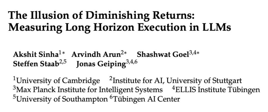 【导读】为什么大模型,在执行长时任务时容易翻车?这让一些专家,开始质疑大模型的推理能力,认为它们是否只是提供了「思考的幻觉」。近日,剑 桥大学等机构的一项研究证明:问题不是出现在推理上,而是出在大模型的执行能力上。 大模型也有「EMO」时刻。 比如,Gemini在Cursor里调试编译错误后,打开了自责「循环模式」,把「I am a disgrace(我很丢脸)」重复了86次。 尽管大模型在复杂推理能力上已有了巨大进步,但上述现象仍使一部分专家认为: 思考模型,只提供了「思考的幻觉」,因为当任务被拉长时它们最终会失败。 近日,剑桥大学等机构的一项研究对这些「翻车」现象作出解释,研究者认为: 问题不在于大模型的推理能力,而在于其执行计划的能力。 边际收益递减的错觉:衡量大语言模型的长时程任务执行能力https://arxiv.org/pdf/2509.09677 也就是说,大模型出现问题未必是源于「思考的幻觉」,而更可能是执行阶段「打滑」了。 研究人员发现,单步准确率的小幅提升,会复利式地放大你能完成的总步骤数,使任务「里程」指数级变长。 随着步骤数量增加,模型的每步准确率会下降——不仅仅是「上下文太长」,还有 ...