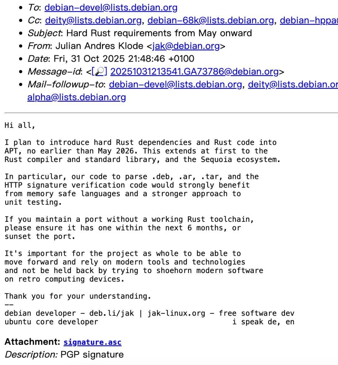 决策核心与动因 - Debian项目宣布自2026年5月起,其APT软件包管理工具将强制要求使用Rust工具链[1] - 决策主要动因是提升安全性,计划将解析deb、ar、tar文件以及HTTP签名验证等相关代码迁移至内存安全语言Rust,并采用更完善的单元测试方法[2] - 项目强调依赖现代工具和技术以向前发展至关重要,避免被老旧设备拖累[2] 技术迁移的具体影响 - APT工具当前使用C++编写,未来将同时包含C++和Rust代码,部分组件将用Rust重写[4] - 迁移将导致一些较冷门且缺乏Rust支持的硬件架构面临挑战,包括m68k、HPPA、SuperH/SH4和Alpha[4] - 具体而言,DEC Alpha、HP PA-RISC和Hitachi SH-4架构目前完全没有Rust编译器,Motorola 68000架构的Rust支持也不足以满足Debian要求[4] - 若特定平台无法编译运行Rust代码,则将无法运行未来版本的Debian系统[4] 社区反应与潜在后果 - 社区反应不一,有观点认为强制迁移轻视了不支持Rust的端口,将其视为“复古计算”而非严肃工程[5] - 有反对意见认为Rust尚未达到APT所需的状态,并质疑此决策[5] - 有理性分析指出迁移的安全性理由充分,且能推动Rust在更多平台的使用,但认为6个月的准备时间过短,部分架构因缺乏LLVM支持可能无法按时完成迁移[5] - 最终结果可能是:若6个月内无开发者修复端口的Rust支持,这些端口将只能使用旧版APT并被官方淘汰[5] - 此事也反映出更深层问题:维护特定端口的成本与开发者及用户社区规模直接相关,维护者时间有限,确保软件在仅占0.1%安装量的架构上编译是沉重负担[6]