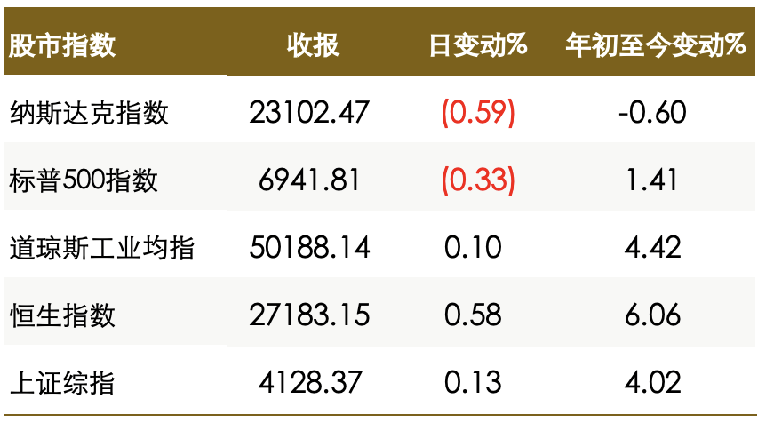 市场表现概览 - 美股道琼斯指数连续三天上涨并创历史新高,收于50,188.1点,日涨幅0.1%[7][8] - 美股标普500指数下跌0.33%,纳斯达克指数下跌0.59%[8] - 欧洲股市个别发展,法国CAC 40指数连升3天,微涨0.06%[8] - 亚太股市普遍上涨,日本日经225指数领涨2.3%,台湾台股指数涨2.1%[19][22] - 港股恒生指数收涨0.58%,大市成交额约2,340亿港元[11] 人民币汇率与宏观分析 - 本轮人民币升值底层逻辑包括:中国企业海外结汇需求、全球对美元不信任及对实物资产货币的需求、中国政策对外“征税”补贴内需[5] - 历史数据显示,约19%的行业会因人民币升值带来利润率提升[5] - 美元指数连续第三天下跌,收于96.80[23] - 美国12月零售销售环比增长停滞,弱于预期的0.4%增幅,导致降息预期上升[4][24][28] 固定收益与债券市场 - 美国国债价格上涨,2年期、10年期、30年期收益率分别下跌3.3、5.9、7.4个基点[28] - Alphabet在不到24小时内发债募资近320亿美元[5][28] - 美国3年期国债拍卖稳健,招标利率为3.518%,低于前值3.609%[28] 行业与个股动态 - Alphabet 2026年资本开支指引为1,750-1,850亿美元,云业务增长超预期[8] - 中芯国际2025年第四季度收入为24.9亿美元,环比增长4.5%,2026年资本支出预计与2025年的81亿美元大致持平[14] - 光伏行业面临“反内卷”催化,银价暴涨可能加速贱金属浆料替代[18] - 日本自民党联盟在众议院选举中获得76%席位,预计将利好防务、核能、零售及AI科技板块[20]