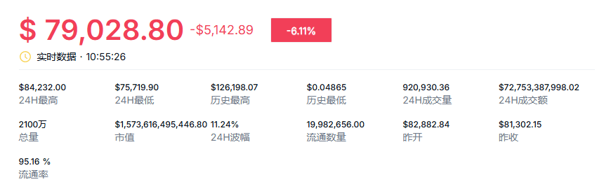 来源:中国经济网 北京时间1日凌晨,比特币一度跌至75719美元/枚,为2025年4月以来的最低水平。1日10时55分,比特币回升至79028.8美元,下跌6.19%。 | $ 79,028.80 -$5,142.89 | | | -6.11% | | | | --- | --- | --- | --- | --- | --- | | ① 实时数据 · 10:55:26 | | | | | | | $84,232.00 | $75,719.90 | $126,198.07 | $0.04865 | 920,930.36 | $72,753,387,998.02 | | 24H最高 | 24H最低 | 历史最高 | 历史最低 | 24H成交量 | 24H成交额 | | 2100万 | $1,573,616,495,446.80 11.24% | | 19,982,656.00 | $82,882.84 | $81,302.15 | | 总量 | 市值 | 24H波幅 | 流通数量 | 昨开 | 昨收 | | 95.16 % | | | | | | 以太坊、SOL、狗狗币等一度跌超10%。截至1日10时59分,以 ...