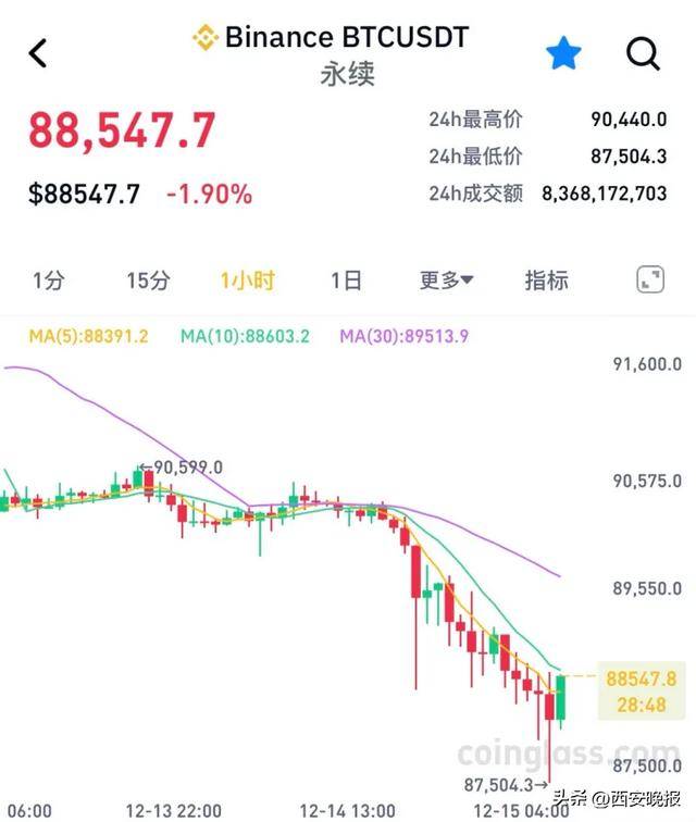 【导读】加密货币集体暴跌,比特币失守8.8万美元,日内跌幅达2.43% 中国基金报记者 张舟综合整理 北京时间12月15日早间,加密货币市场普遍走弱,比特币跌破8.8万美元/枚关口,24小时跌幅达2.43%。 截至发稿,比特币价格小幅回升,现报88547.7美元/枚,日内下跌1.9%。 加密货币集体下跌,以太坊报3073美元/枚,24小时跌1.09%;SOL跌2.36%。此外,狗狗币、BNB等均大跌。 | BTC | 88427 | -1.94% | | --- | --- | --- | | $612.3亿 +3.6% | | | | ETH | 3073 | -1.09% | | $391.2亿 -0.2% | | | | SOL | 129.9 | -2.36% | | $72.1亿 +2.2% | | | | XRP | 1.984 | -1.77% | | $35.8亿 +4.9% | | | | HYPE | 28.9 | -2.55% | | $16亿 -1.8% | | | | BNB | 881.2 | -1.88% | | $13.4亿 -1.6% | | | | DOGE | 0.134 ...