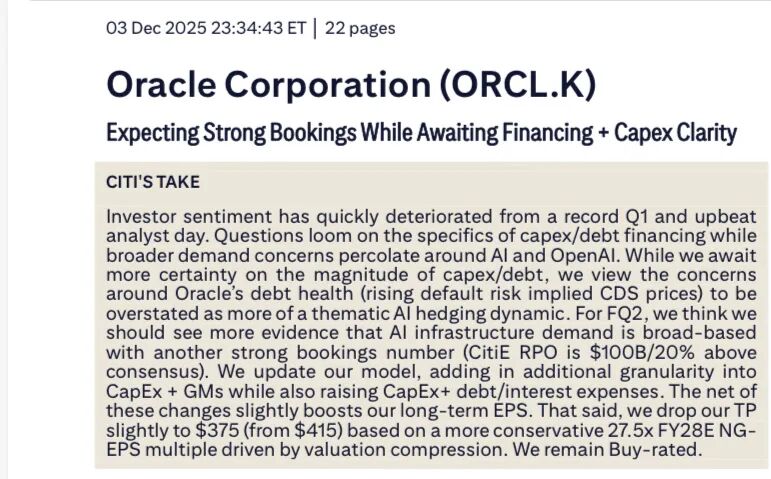 核心观点 - 花旗研究维持对甲骨文公司的买入评级,但将目标价从415美元下调至375美元,基于调整后的估值,预期回报仍高达81% [2][8] - 尽管市场对公司的债务健康和AI需求可持续性感到焦虑,但花旗认为市场担忧过度,公司基本面依然强劲,核心逻辑在于AI基础设施需求正从头部玩家向更广泛的领域扩散,公司凭借其OCI云基础设施的差异化定位持续获得大单 [2][3][8][9] 财务预测与估值调整 - 花旗更新了公司的每股收益预测,其中2026财年预测为6.80美元,2027财年为7.93美元,2028财年为10.65美元 [2][8] - 目标价下调的核心原因是估值倍数压缩,从之前隐含的更高倍数降至27.5倍2028财年非公认会计准则每股收益,反映了市场对高资本支出时代盈利能力的审慎预期 [5][11] 关键运营指标与预期 - 花旗预测公司第二财季的剩余履约义务将达到惊人的6000亿美元级别,较市场共识高出整整20% [2][8] - 花旗将公司2026财年的资本支出预期上调至400亿美元以上,而市场共识仅为350亿美元 [5][11] - 预计未来数年,公司用于AI OCI的资本支出将攀升至每年600亿至700亿美元的水平 [5][11] 市场情绪与渠道反馈 - 投资者情绪从创纪录的第一财季和乐观的分析师日后迅速恶化 [3][9] - 花旗认为信用违约互换价格上升更多是AI板块整体对冲情绪的体现,而非公司基本面恶化 [3][9] - 渠道调查显示混合信号:经销商配额达成率从60%升至66%,但未来十二个月增长预期却放缓约2.5个百分点至约2% [5][11] - 软件即服务仍是经销商销售主力,占云业务收入的半壁江山 [5][11] 行业趋势与公司定位 - AI基础设施需求正从少数头部玩家向更广泛的领域扩散 [3][9] - 公司正押注其能在AI基础设施的军备竞赛中持续获益 [5][11]