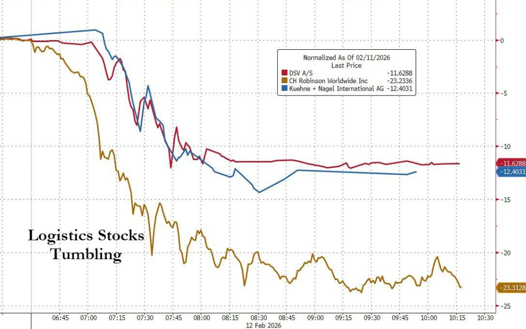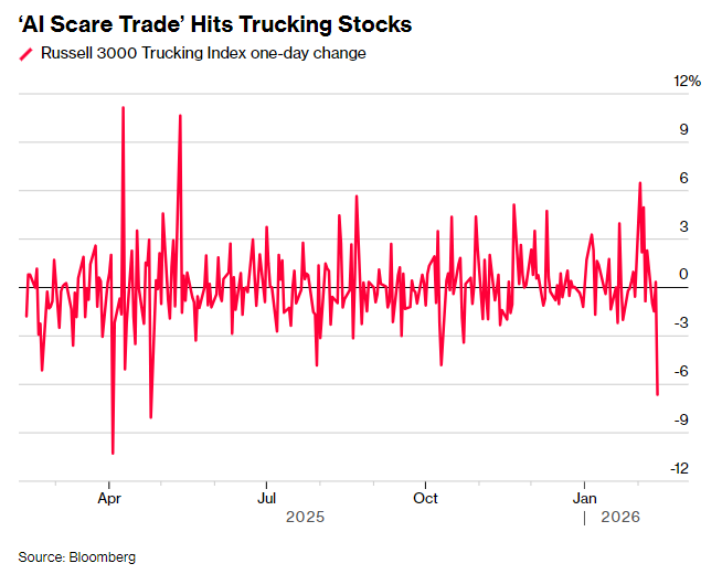 文章核心观点 - AI技术冲击波正从软件、金融等领域扩散至物流等传统行业,引发全球股市相关板块的“恐慌性交易”和抛售,市场焦虑与技术红利深度交织 [2][3][7] 全球物流板块市场表现 - **美股市场**:当地时间2月12日,罗素3000卡车运输指数重挫7.8%,盘中一度暴跌超9% [2][5] - 罗宾逊全球物流(CHRW)大跌14.54%,盘中一度暴跌24% [2][5] - 康捷国际物流(EXPD)跌13.18%,盘中一度大跌近20% [2][5] - Landstar System跌15.60%,盘中一度大跌近20% [5] - JB Hunt运输服务(JBHT)跌超5%,XPO跌近6% [5] - **欧洲市场**:同日,德讯集团等物流股大幅下跌,德讯集团跌近13% [2] - **A股市场**:2月13日午盘,交通运输板块部分个股大幅下挫 [4] - 中远海能跌8.06%,盘中一度跌超9% [4] - 招商南油跌6.99%,盘中一度跌超8% [4] - 招商轮船跌6.66% [4] - 中远海特、海航科技、锦江航运等跌超3% [4] - 中远海发、宁波远洋、国航远洋、东航物流等跌超2% [4] AI冲击的直接诱因 - **物流行业**:小型AI物流公司Algorhythm Holdings(RIME)宣布,其SemiCab平台在客户实际部署中,帮助客户在不增加运营人员的情况下,将货运量提升了300%至400% [5] - 该公司宣称,使用其平台的个体运营商每年能管理超过2000个货运订单,而传统行业基准是每个货运经纪人每年约500个订单,意味着员工生产力提高了4倍 [6] - 此消息推动Algorhythm股价盘中一度飙升79%,收盘上涨近30%,但其市值仍低于1000万美元 [6] - **金融与房地产行业**:此前,金融服务股和房地产股已因另一家小公司Altruist推出AI驱动税务软件而出现抛售 [2][7] 市场反应与分析师观点 - **“先抛售再思考”模式**:杰富瑞分析师指出,当前美股市场所有板块只要出现AI相关消息,都会引发恐慌性交易,但此状况何时结束尚无定论 [7] - **跨板块抛售蔓延**:软件股的抛售仍在延续,AppLovin(APP)尽管财报超预期且高管试图将AI描述为积极催化剂,其股价在2月12日仍大跌19.68% [7][8] - **市场影响范围**:截至2月12日,这轮跨板块抛售主要局限于股市,尚未明显影响货币政策讨论,但若市场动荡持续可能改变 [8] - 当日美股主要股指普遍承压,纳斯达克综合指数下跌2%,标普500指数下跌约1.5%,道琼斯工业平均指数下跌约1.3% [8] - **投资者行为分析**:瑞银策略师指出,投资者正逐行业寻找基本面脆弱迹象,市场普遍相信AI变革正加速渗透多行业,但冲击的具体时间不确定 [8] 2026年初AI产业格局 - **亚洲市场**:凭借HBM4、先进封装等技术主导AI供应链,台积电、三星电子、SK海力士等巨头业绩大幅增长,股价迭创新高 [7] - **美国市场**:陷入“AI恐慌抛售”,物流、金融、软件板块遭无差别抛售 [7]