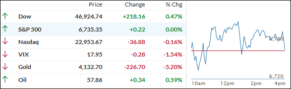 [Chart courtesy of MarketWatch.com][Chart courtesy of MarketWatch.com]Moving the marketThe S&P 500 and Nasdaq stumbled in early trading, weighed down by weak tech performance after the recent surge.By the close, the S&P 500 clawed back to green, while the Dow powered to a fresh record high.The Nasdaq wasn’t so lucky, finishing with a moderate loss as big names in artificial intelligence—like Nvidia, CoreWeave, Micron Technology, Oracle, and Palantir Technologies—sold off amid growing worries about peaked va ...