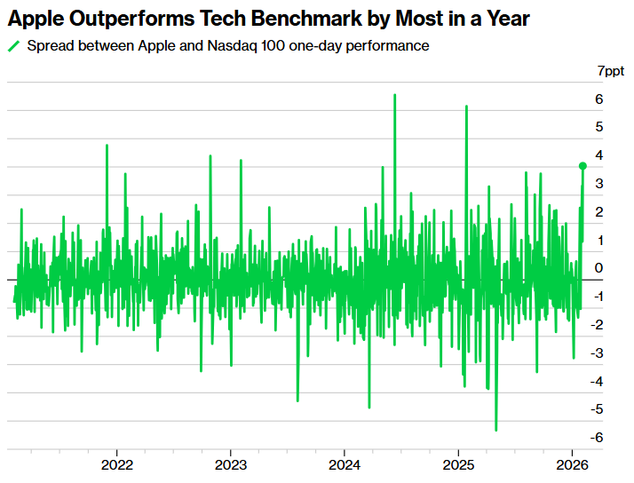 核心观点 - 在人工智能引发市场广泛担忧的背景下,苹果公司因其硬件平台的定位和稳健的财务表现,被视为安全的避风港,股价走势与科技板块及整体市场出现显著分化 [1][3] 股价与市场表现 - 苹果股价在特定交易日收涨2.6%,而纳斯达克100指数下跌1.77%,创下自2025年初以来最大幅度的跑赢大盘表现 [1] - 当月苹果股价累计上涨近6%,同期纳斯达克100指数下跌3.3% [1] - 股价上涨使苹果市值略高于4万亿美元,超越Alphabet成为全球第二大公司,仅次于英伟达 [1] 行业分化与市场情绪 - 市场分化反映了苹果公司的积极势头与科技行业其他领域日益增长的不确定性 [3] - 人工智能工具(如Alphabet和Anthropic推出)的发布引发了科技股的普遍抛售,因投资者担忧人工智能服务会蚕食公司增长 [3] - 软件股普遍承压,追踪该板块的热门ETF下跌2.7%,有望创下两年多来最长的连续七日下跌纪录 [3] - 微软股价年内下跌14%,因其云计算业务财报表现令人失望,且人工智能领域投入受到更多关注 [3] 公司基本面与战略 - 苹果公司近期公布的财报显示其季度销售额创下历史新高,且业绩指引超出预期 [3] - 公司被视为非高风险股,有望从人工智能普及中受益,因为iPhone等硬件设备将成为用户访问AI服务的核心平台 [3] - 苹果与谷歌达成一项多年协议,由谷歌为其人工智能技术(包括Siri)提供支持 [3] - 公司决定不参与人工智能军备竞赛的战略,使其避免了为资助大量基础设施和项目而背负巨额债务和资本支出 [4]